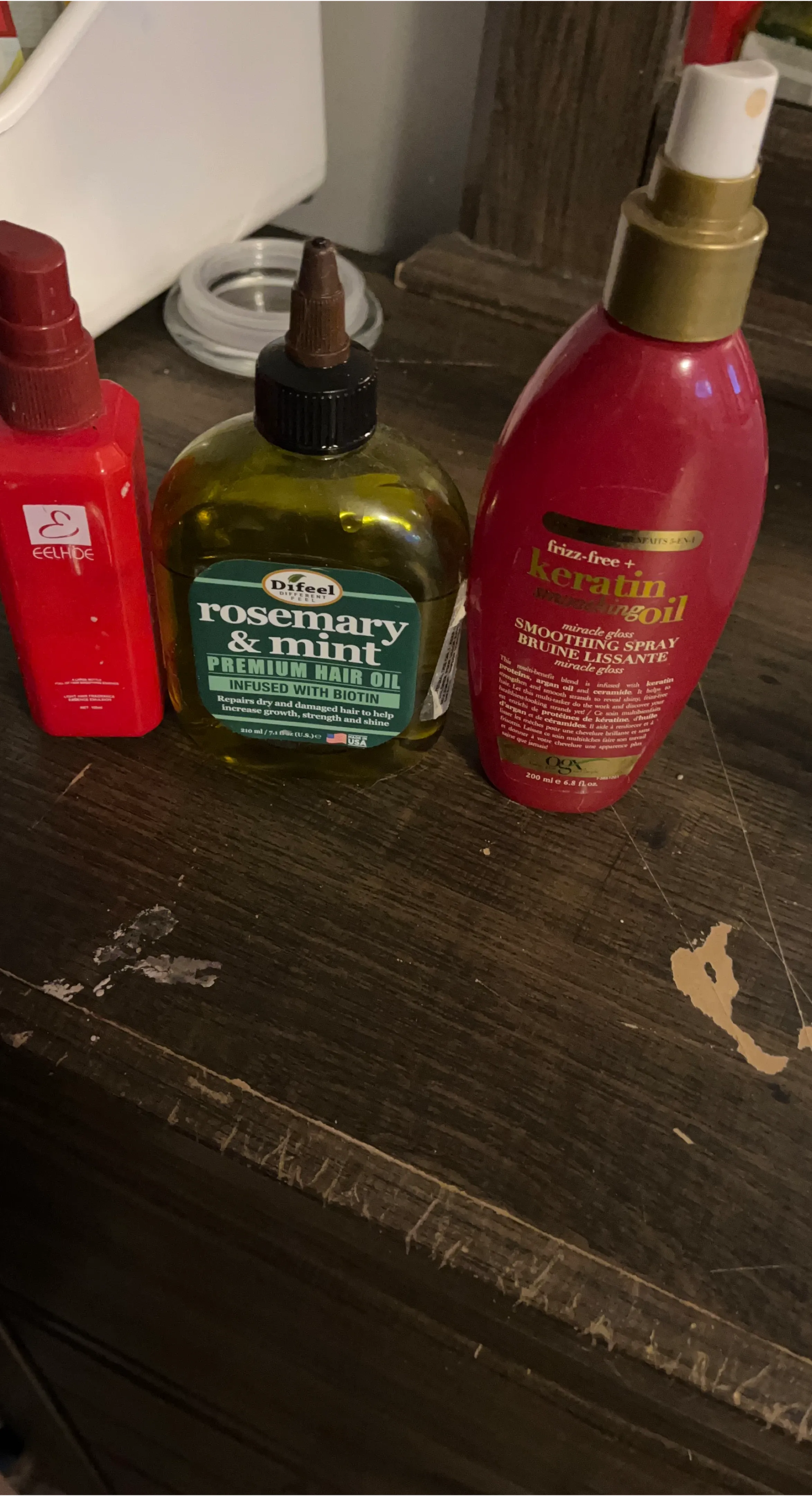 Selling a bottle of Difeel rosemary & mint premium hair oil. It's infused with biotin and great for repairing dry and damaged hair to help increase growth, strength and shine. Also available is OGX frizz-free + keratin smoothing oil miracle gloss smoothing spray and Eelhoe hair oil.