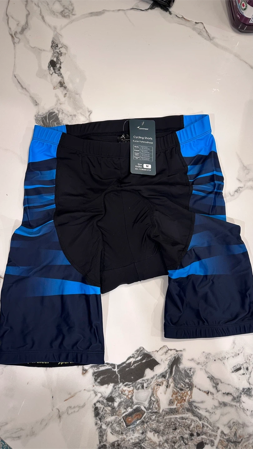 Sportneer cycling shorts in size M. These shorts are made with 82% nylon and 18% spandex for the body, and 85% polyester and 15% spandex for the printed fabric. Great for your next bike ride!