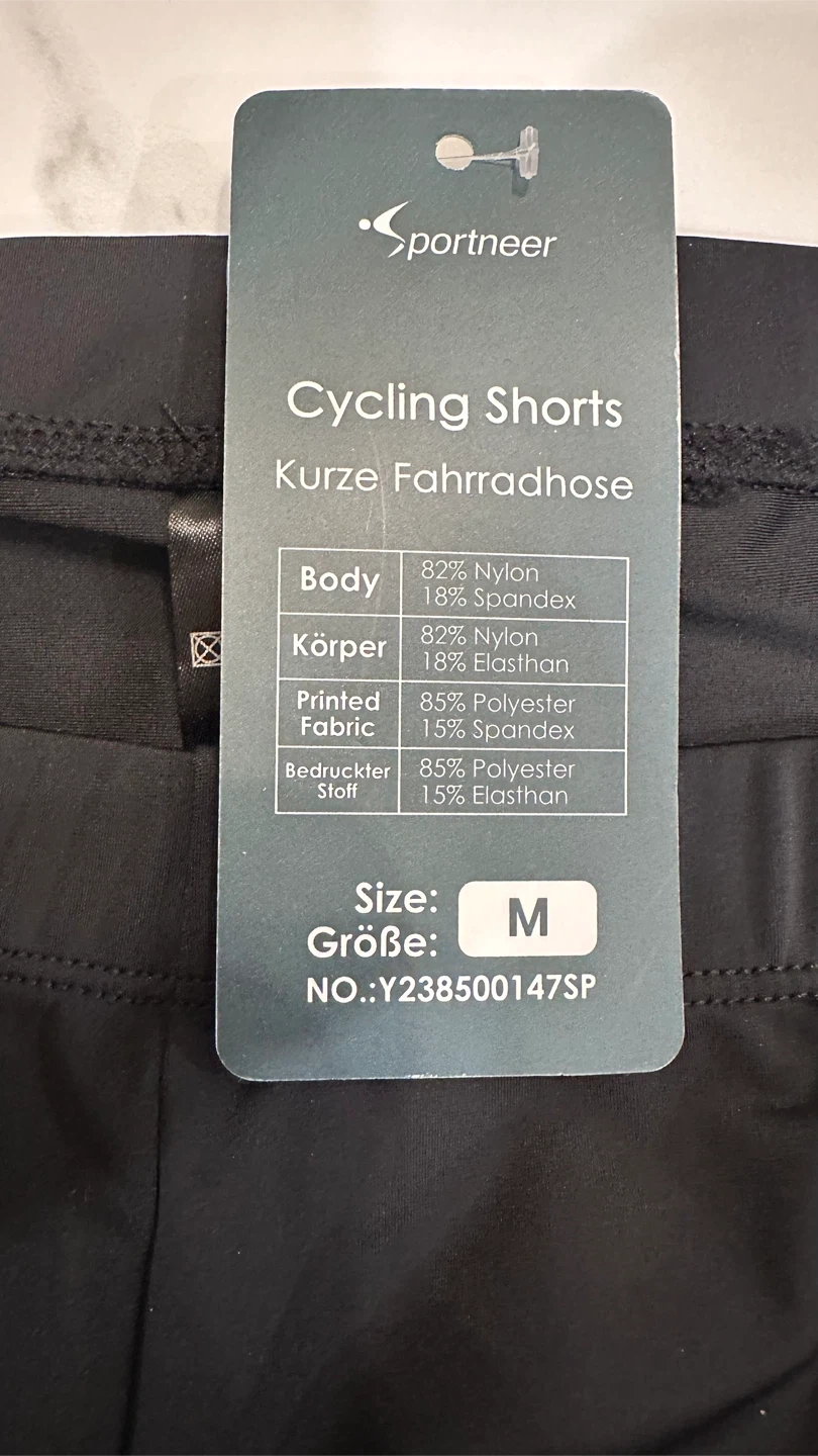 Sportneer cycling shorts in size M. These shorts are made with 82% nylon and 18% spandex for the body, and 85% polyester and 15% spandex for the printed fabric. Great for your next bike ride!