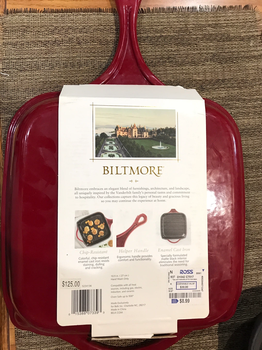 I'm selling a new Biltmore Enamel Cast Iron Grill Pan! It's chip-resistant and oven-safe up to 500°F. The ergonomic handle provides comfort and functionality. The interior has a smooth, sealed matte black finish, perfect for traditional seasoning. Originally bought for $30 at Ross