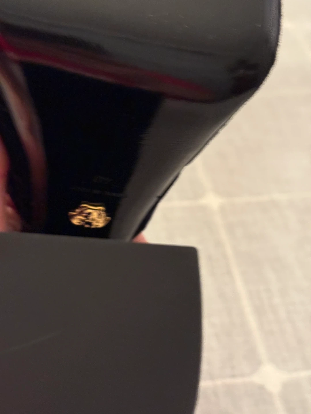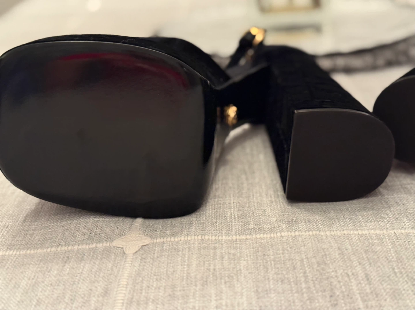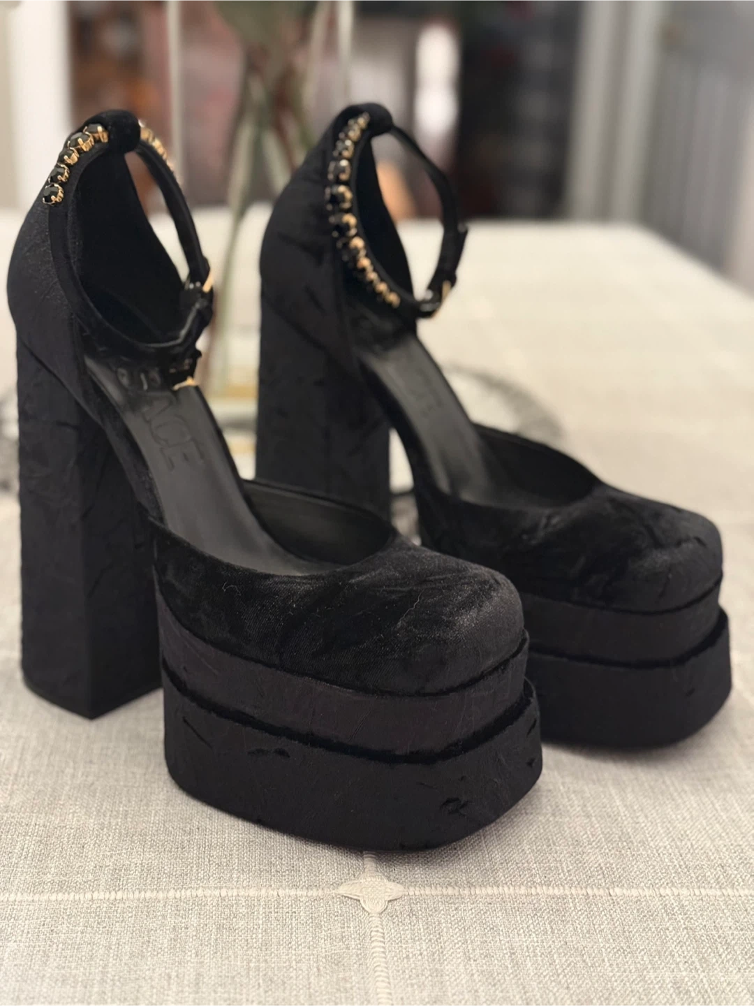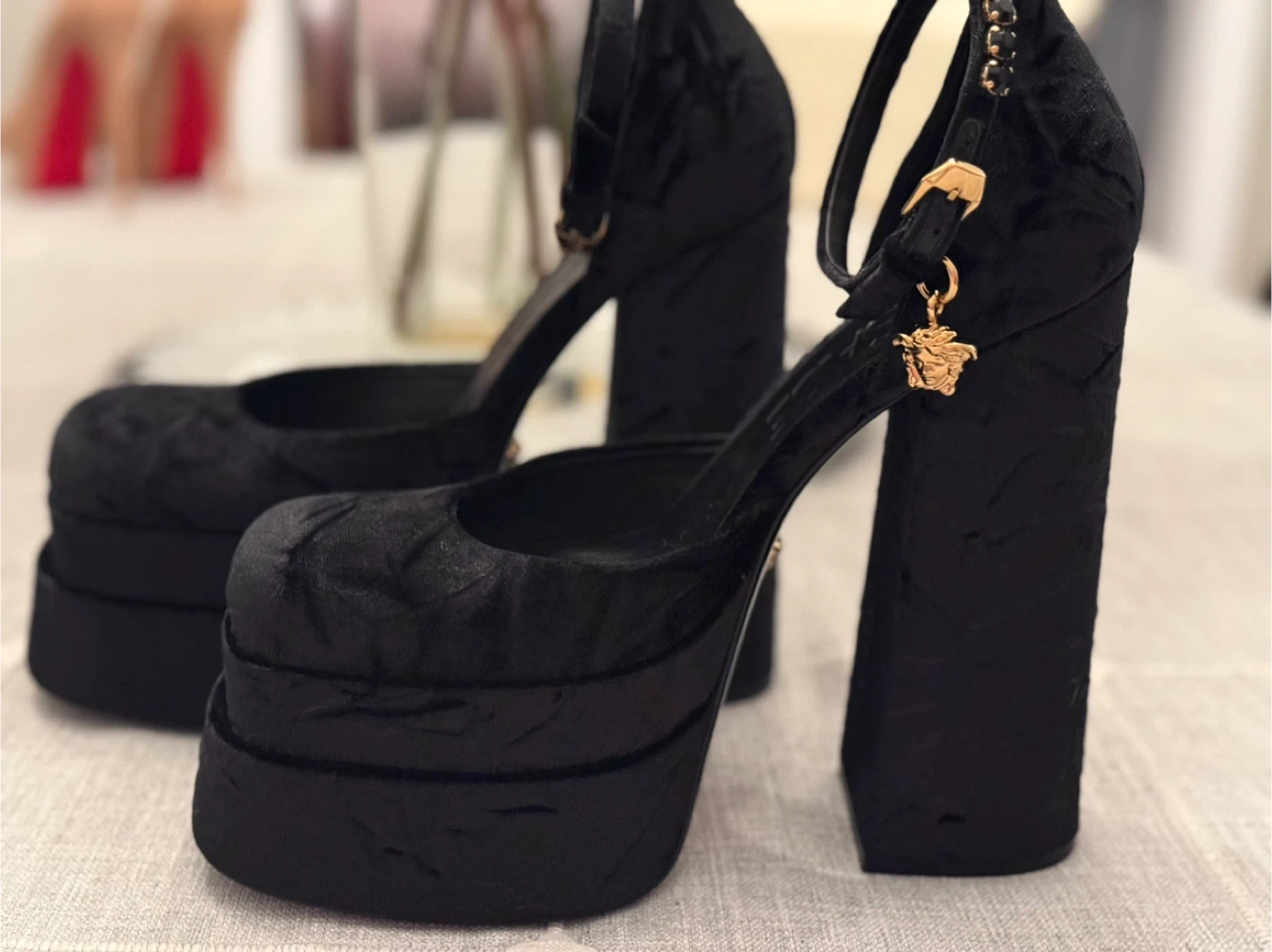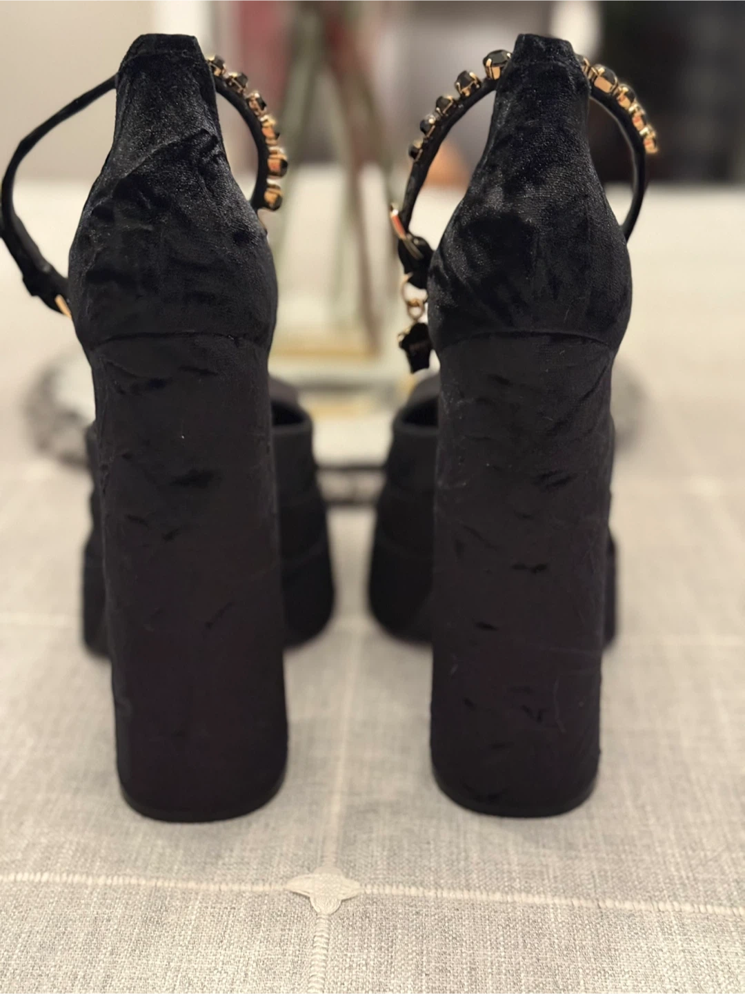 These striking black velvet platform heels are from Versace. They feature a chunky block heel and a delicate ankle strap adorned with crystals and the iconic Medusa charm. These shoes offer both statement style and elevated height!