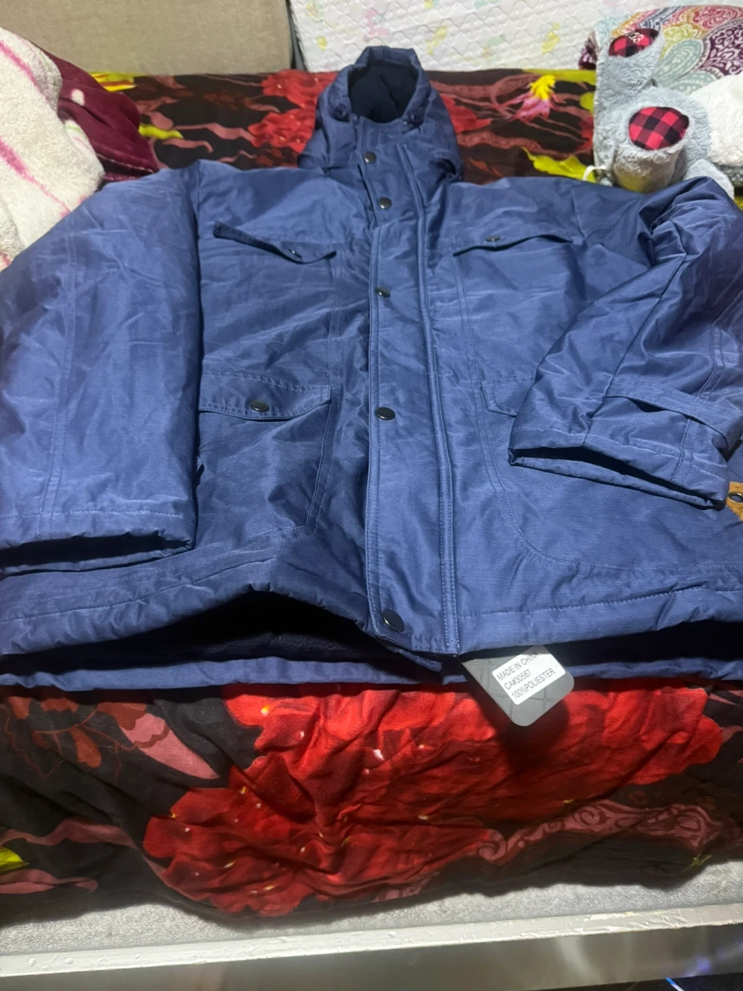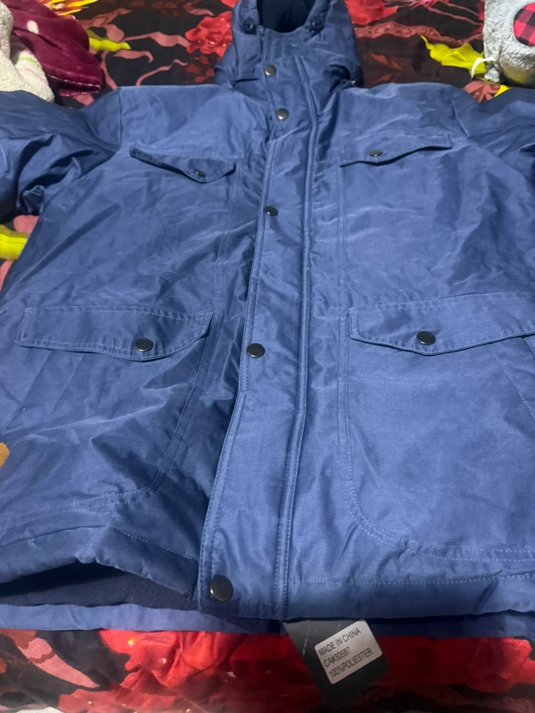 Selling a blue puffer jacket, perfect for staying warm this winter! It features a hood and multiple pockets for your convenience. The jacket is made of 100% polyester.