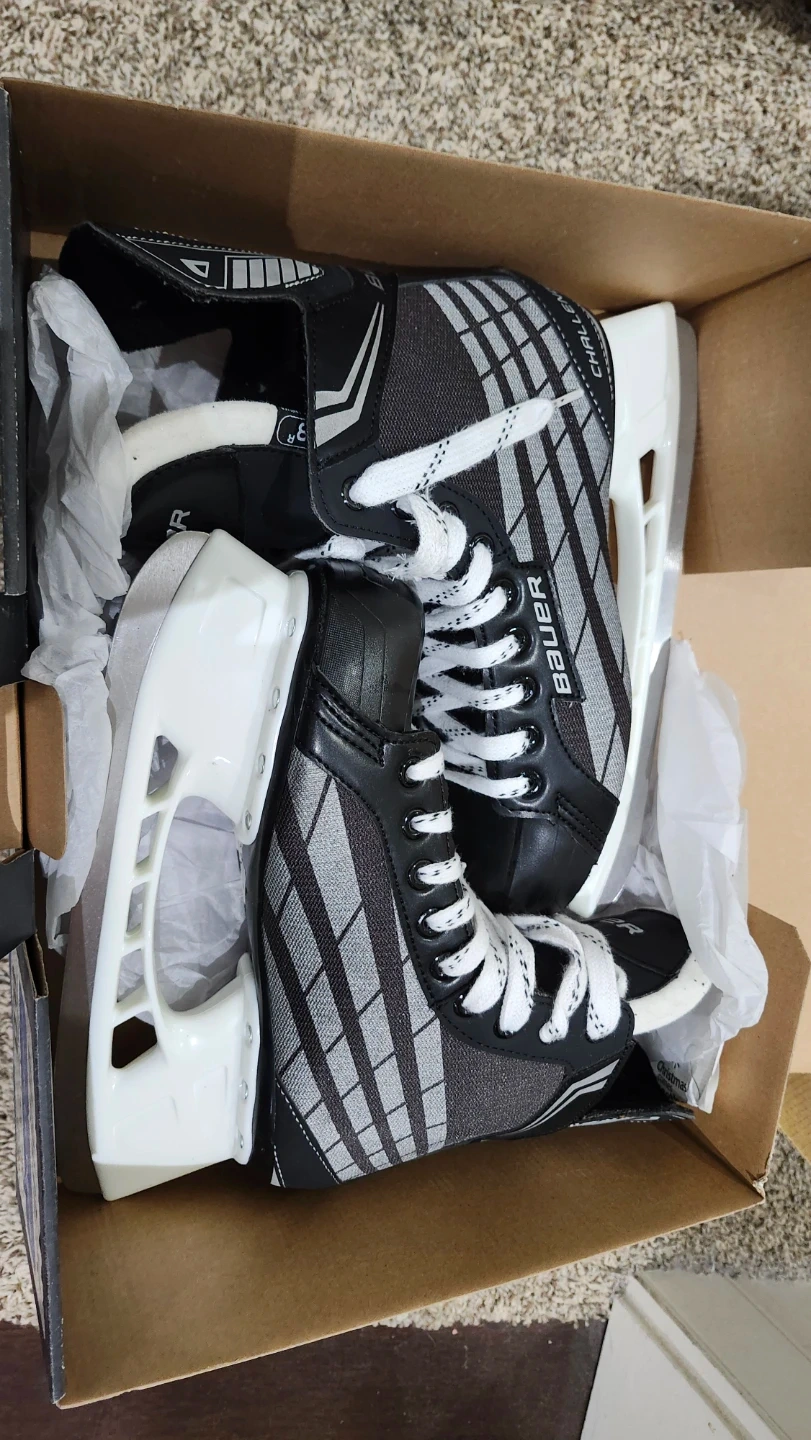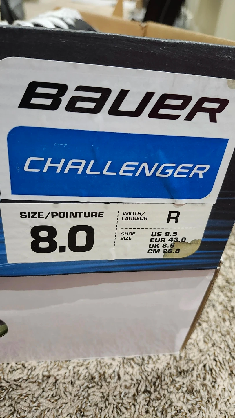 New Bauer Challenger hockey skates in size 8.0 R. Skates come with the original box and packaging. They're ready for the ice! They have never been used.
