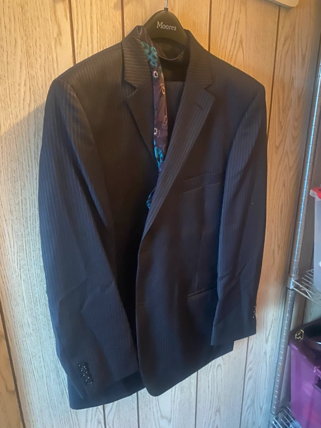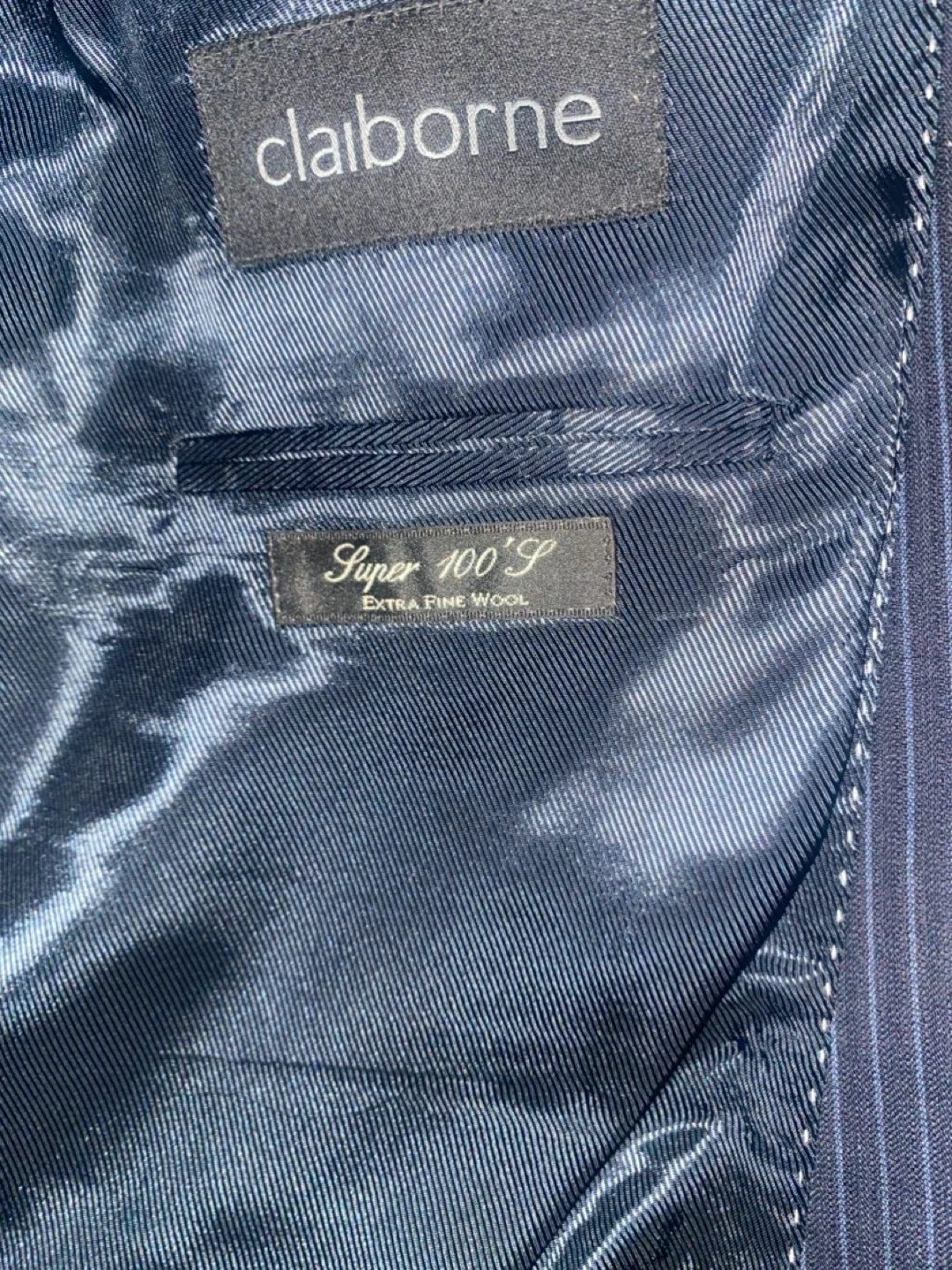 Claiborne men's suit, made from Super 100's extra fine wool. It's a pinstripe design in a dark colour. Includes a patterned tie from Protocol. Perfect for formal occasions!