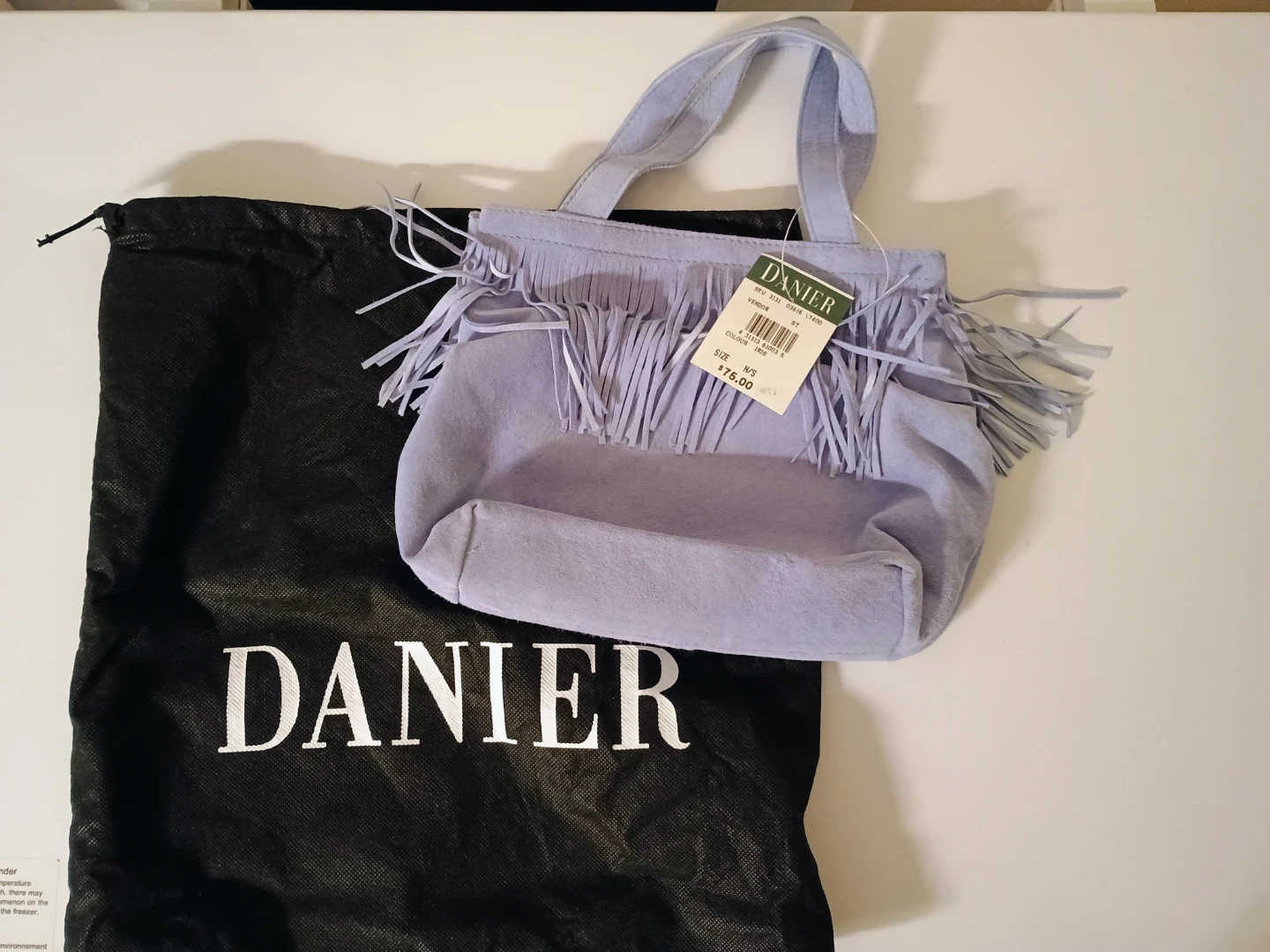 This Danier handbag is a light purple colour with fringe detailing. It's made of suede material. Includes a Danier dust bag.