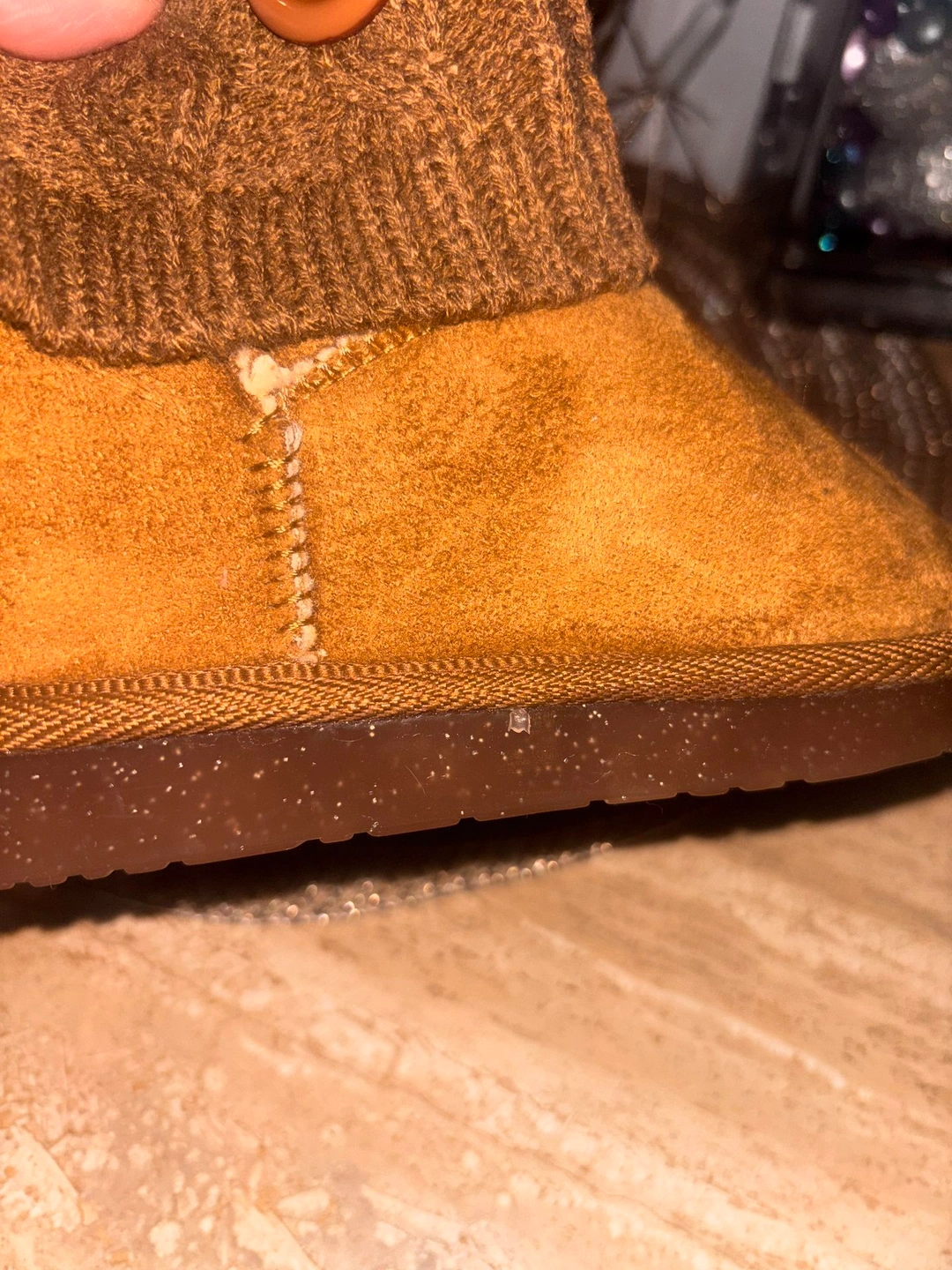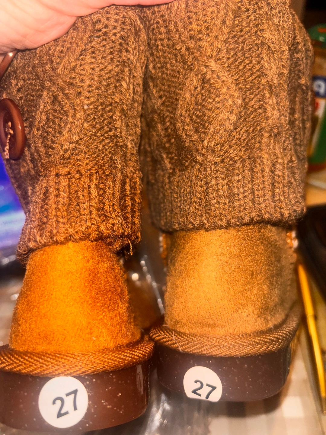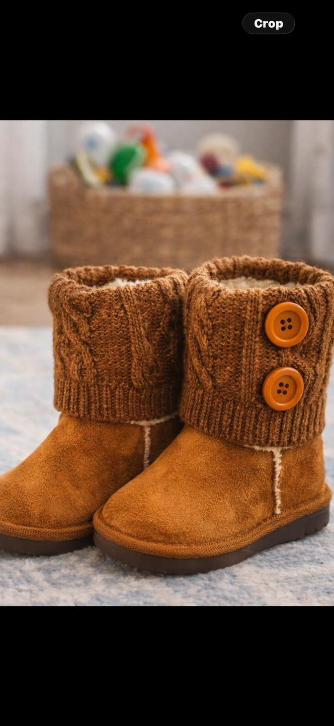 Adorable toddler booties in a warm brown suede-feel finish with cozy faux-fur lining and a soft knit cuff accented with decorative buttons. Lightweight, flexible sole for comfort and easy movement. Size: EU 27 (approx. US Toddler 10). Condition: Brand new, never worn, tags still attached. Perfect for fall and winter outfits.