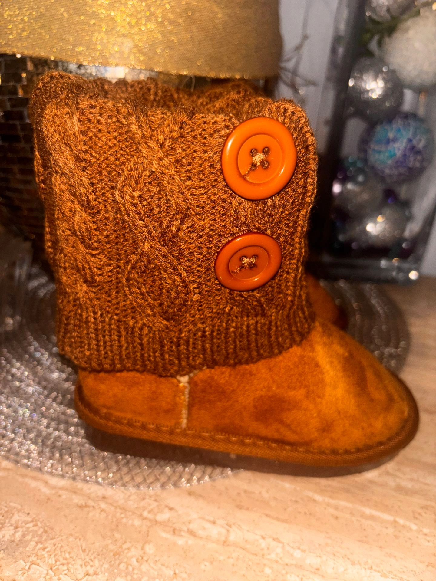 Adorable toddler booties in a warm brown suede-feel finish with cozy faux-fur lining and a soft knit cuff accented with decorative buttons. Lightweight, flexible sole for comfort and easy movement. Size: EU 27 (approx. US Toddler 10). Condition: Brand new, never worn, tags still attached. Perfect for fall and winter outfits.