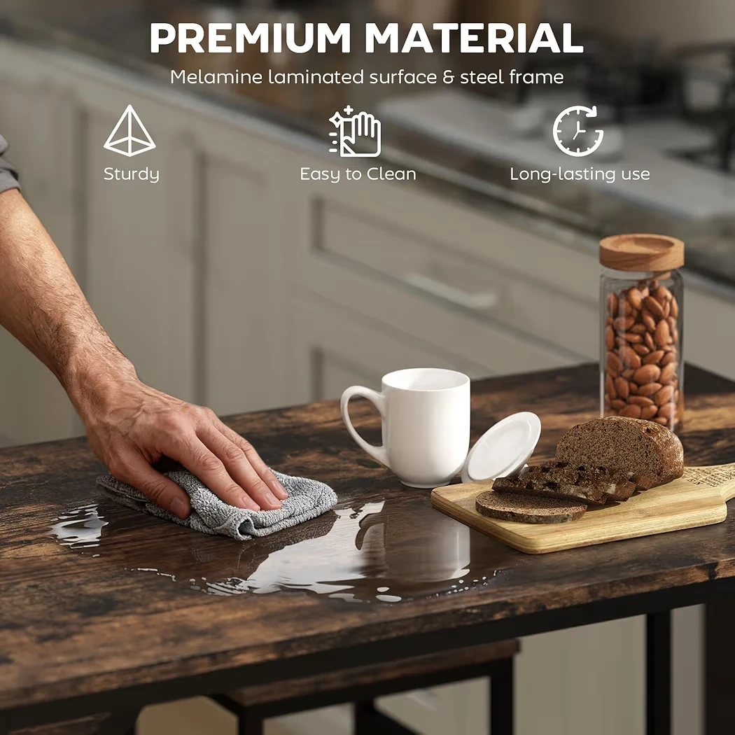 This bar height dining set includes one table and four stools. The table has a melamine laminated surface and steel frame, with adjustable protective levers for stability. It's easy to clean and built for long-lasting use. This functional dining set includes a rectangular bar table and 4 matching stools. It's perfect for creating a cozy dining and relax with your family and friends. Armless stools offer free movement for an unrestricted seating experience, and can be neatly located under the desk to save space when not in use Kitchen Table Set Info: 39.4" W x 23.6" D x 34.6" H (100 x 60 x 88 cm) (table), 12.6" W x 12.6" D x 22.4" H (32 x 32 x 57 cm) (stool). Weight Capacity: 55lbs/25 kg (table), 220lbs/100 kg (stool)