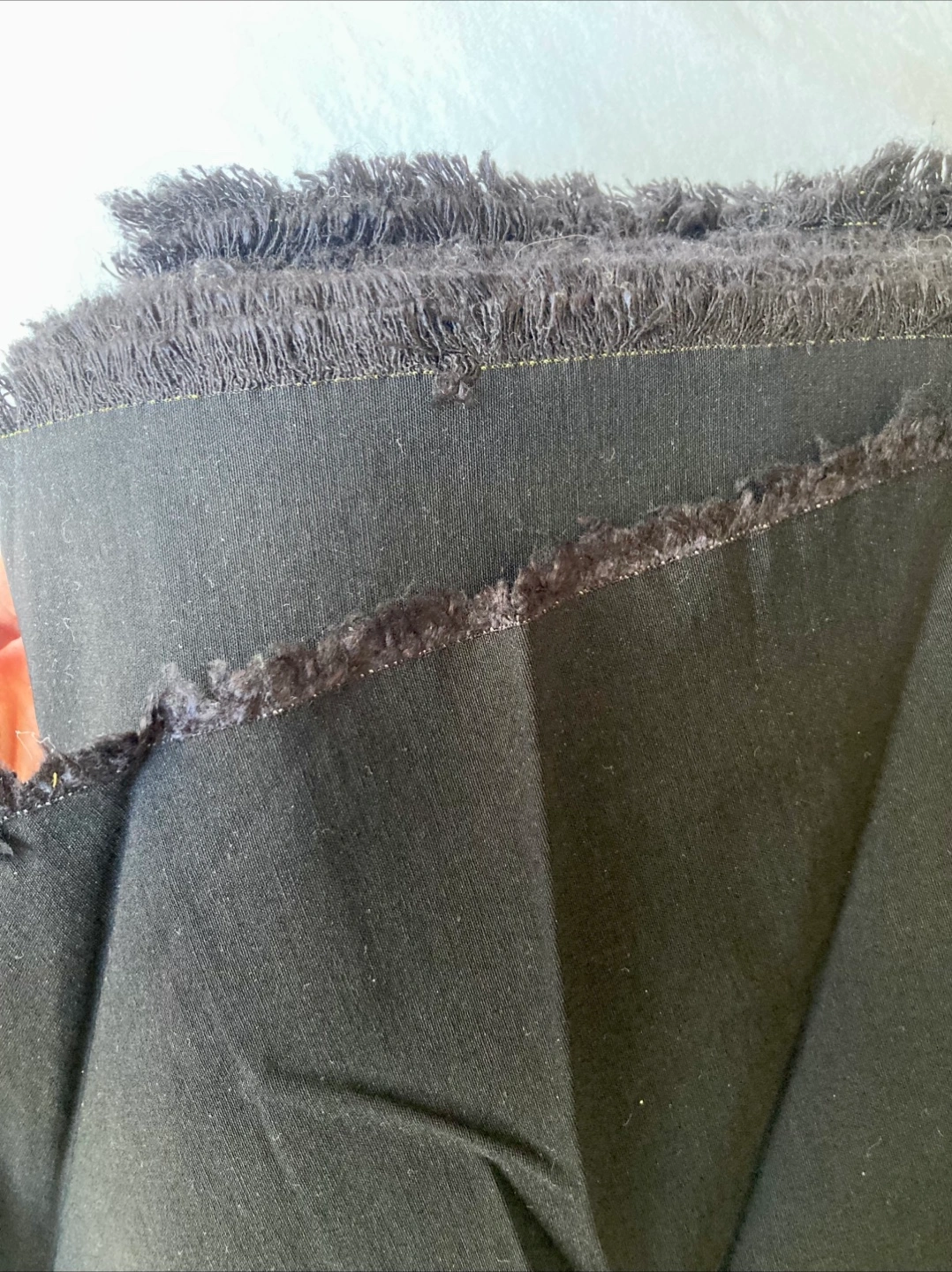 Just over 9m jet black (bad lighting in pics) poly cotton spandex fabric.