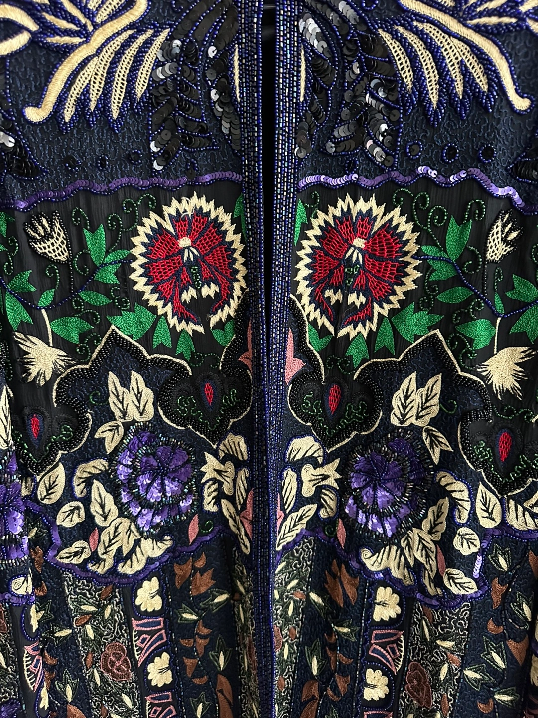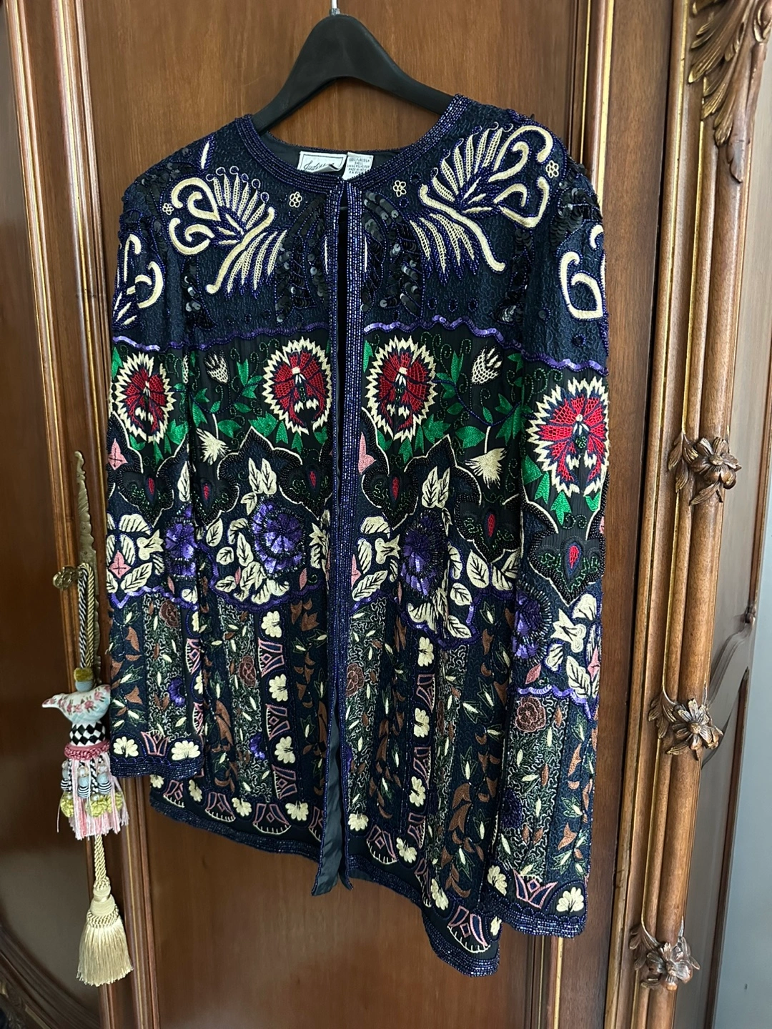 Make a bold statement with this Judith Ann vintage jacket, featuring a luxurious and ornate pattern that exudes elegance. Perfect for formal events or as a stunning cocktail party piece, it combines a rich multicolor palette with intricate embroidery and beading. Crafted from premium silk sourced from India, this jacket is a true testament to vintage luxury fashion.