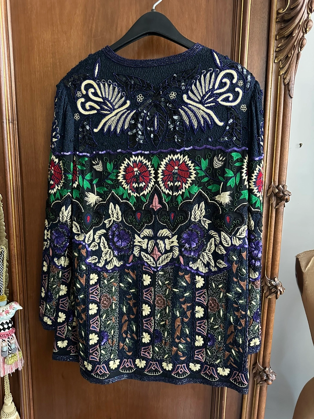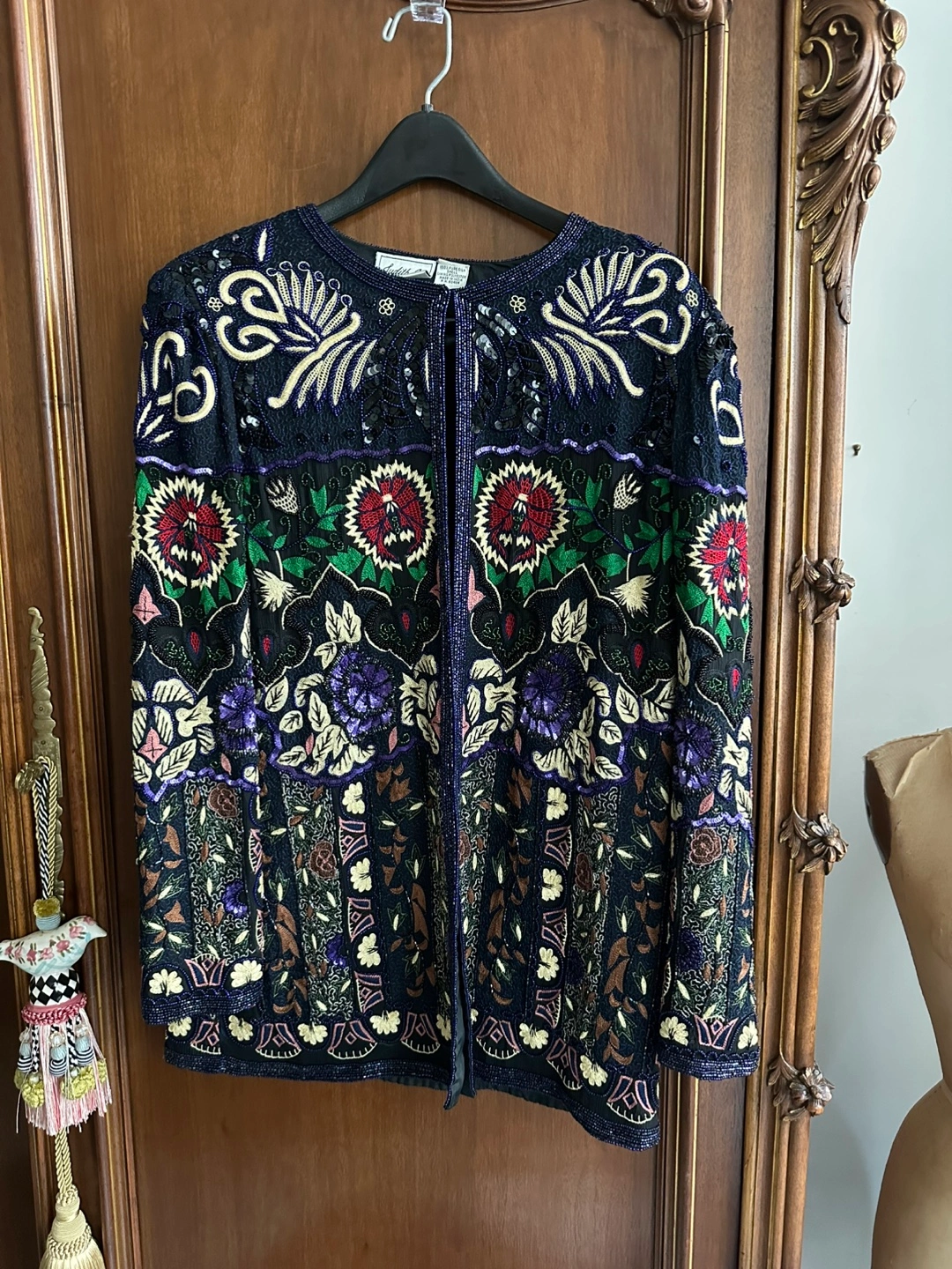 Make a bold statement with this Judith Ann vintage jacket, featuring a luxurious and ornate pattern that exudes elegance. Perfect for formal events or as a stunning cocktail party piece, it combines a rich multicolor palette with intricate embroidery and beading. Crafted from premium silk sourced from India, this jacket is a true testament to vintage luxury fashion.