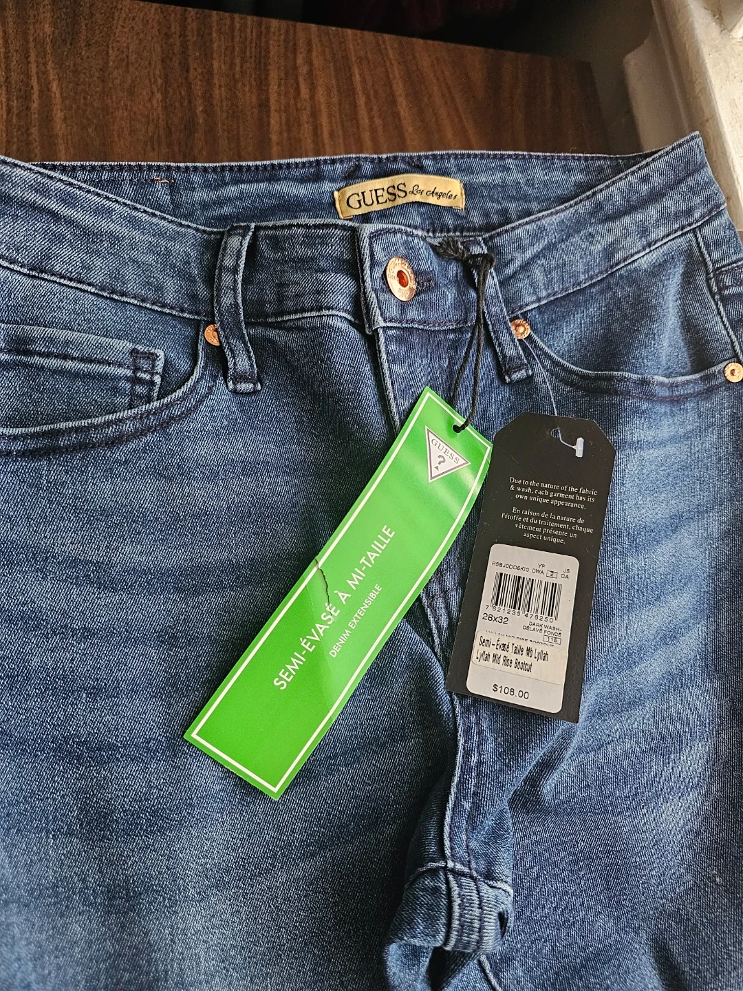 These are Guess semi-flare mid-rise denim jeans. They're made with extensible denim for comfort and fit. The jeans have a classic blue wash.