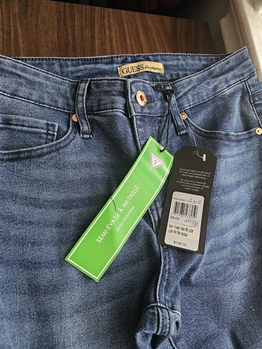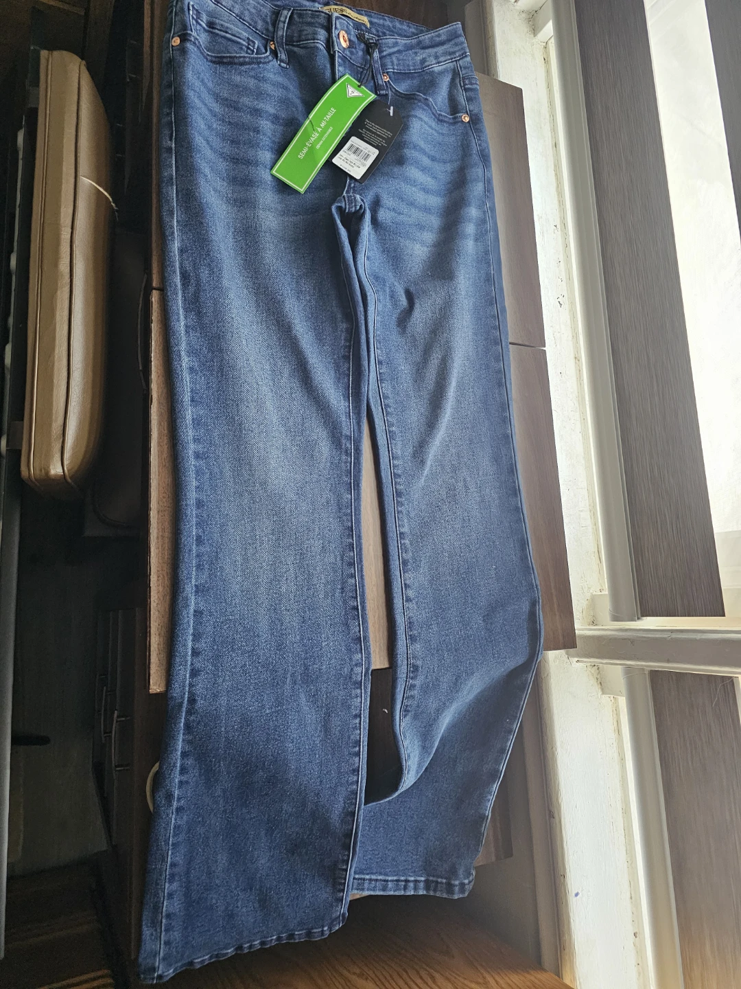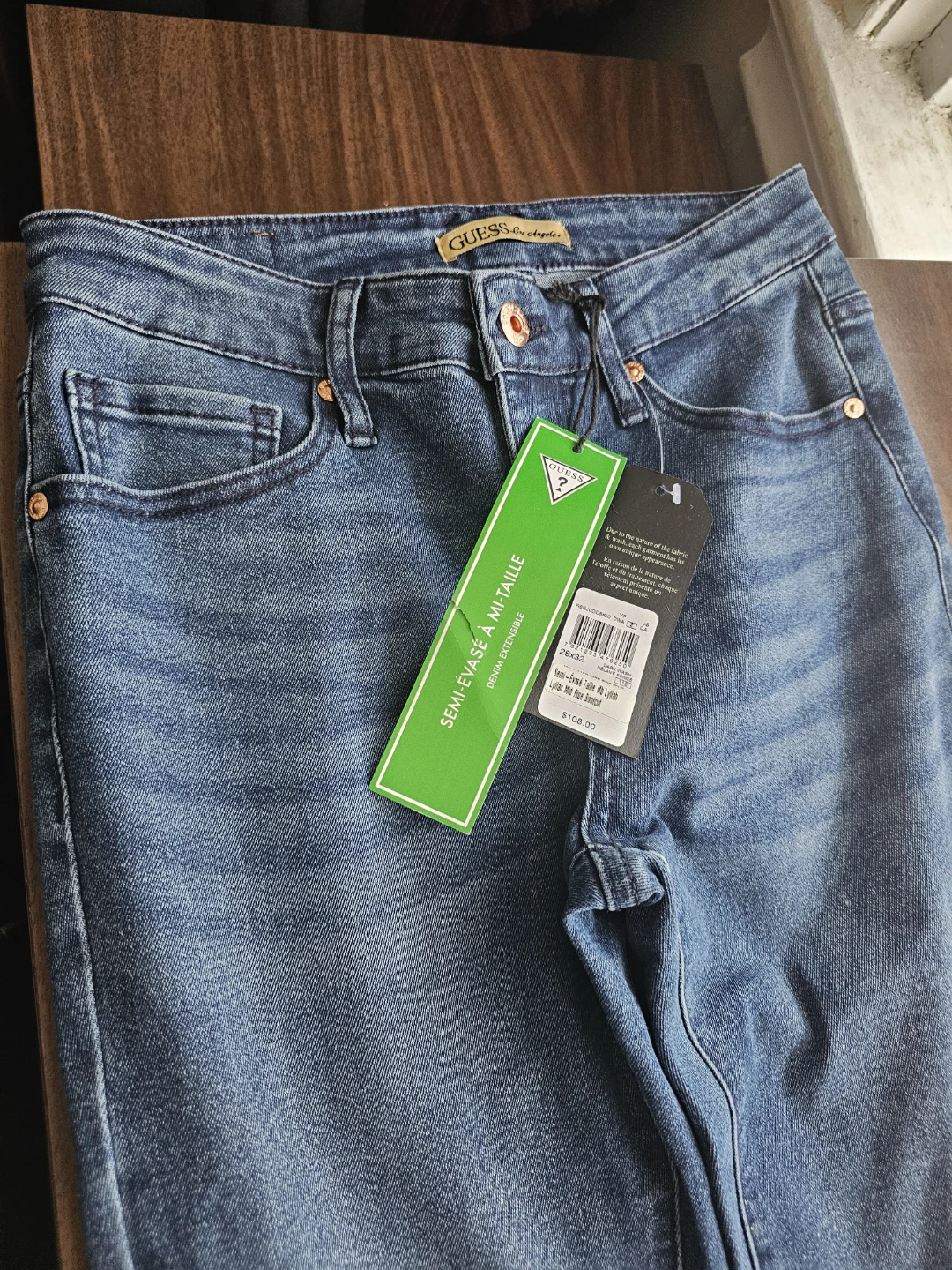 These are Guess semi-flare mid-rise denim jeans. They're made with extensible denim for comfort and fit. The jeans have a classic blue wash.