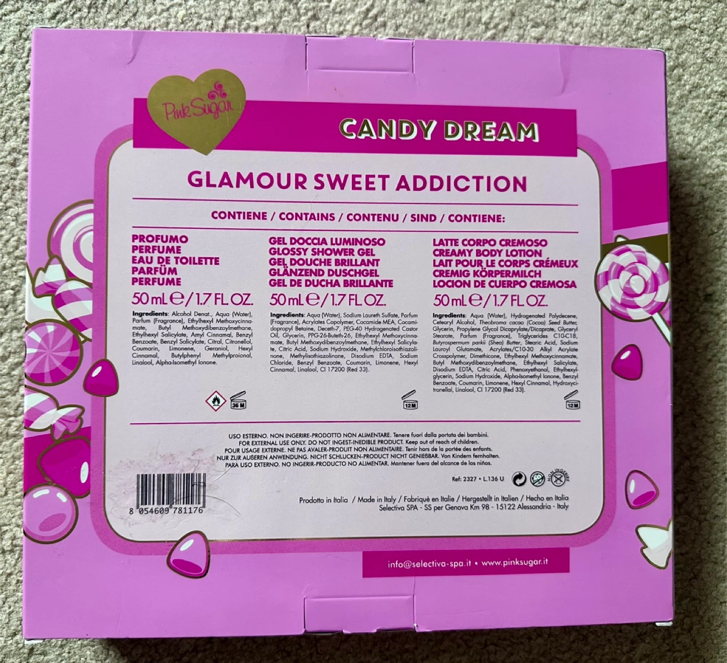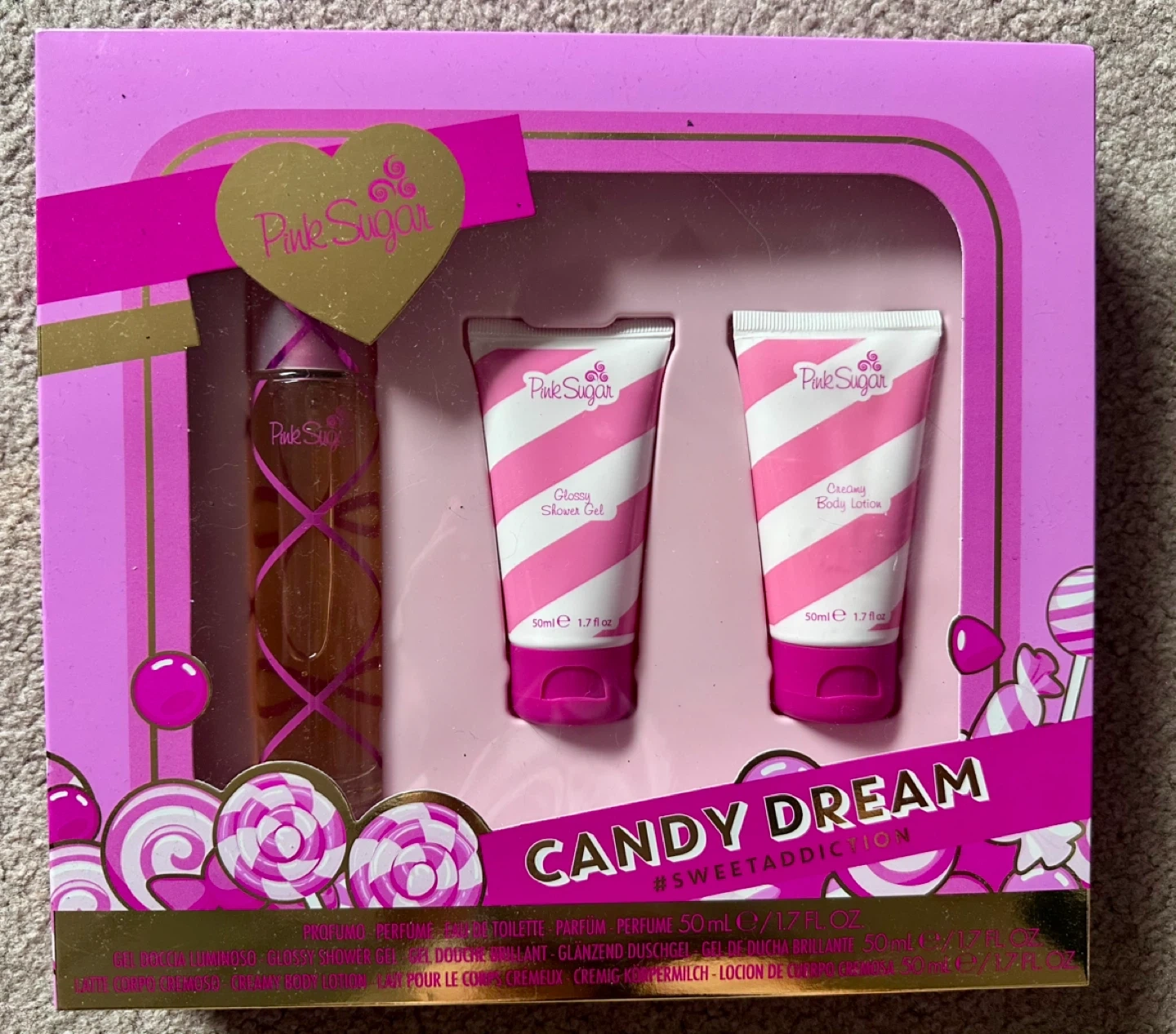 This "Candy Dream" gift set by Pink Sugar includes Eau de Toilette, Shower Gel, and Body Lotion. All products are 50ml/1.7 fl.oz. It's a glamour sweet addiction set.