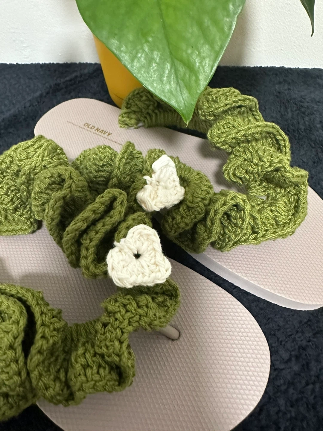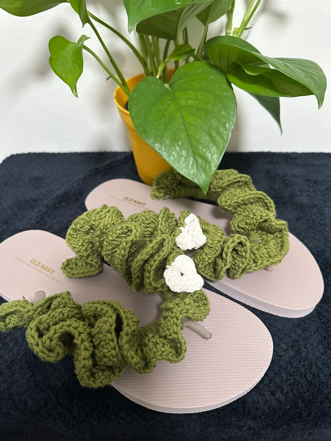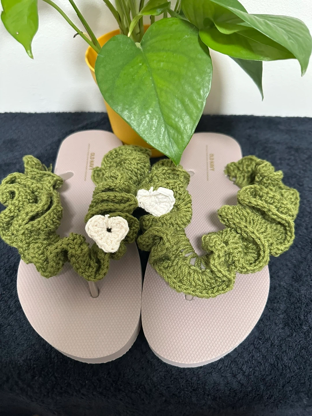 Cute Old Navy sandals with unique green crochet detailing! These sandals are perfect for adding a touch of handmade charm to your summer outfits. They are in good condition and ready for a new home
