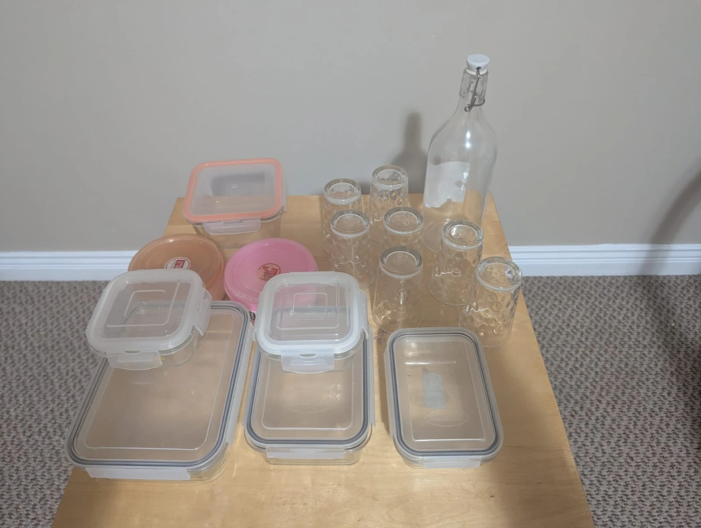 A collection of clear glass food storage containers with locking lids and a set of patterned drinking glasses. It also includes a large swing-top bottle. This set is great for storing leftovers or packing lunches.