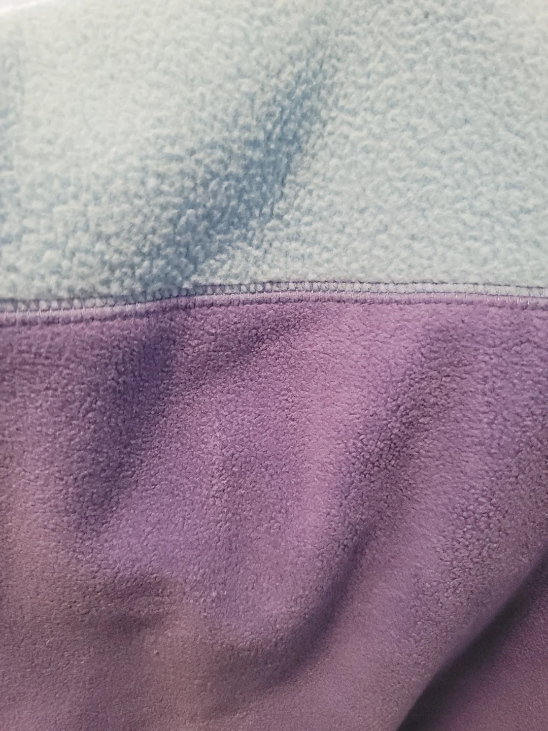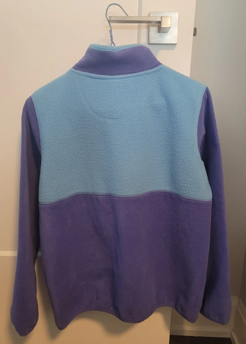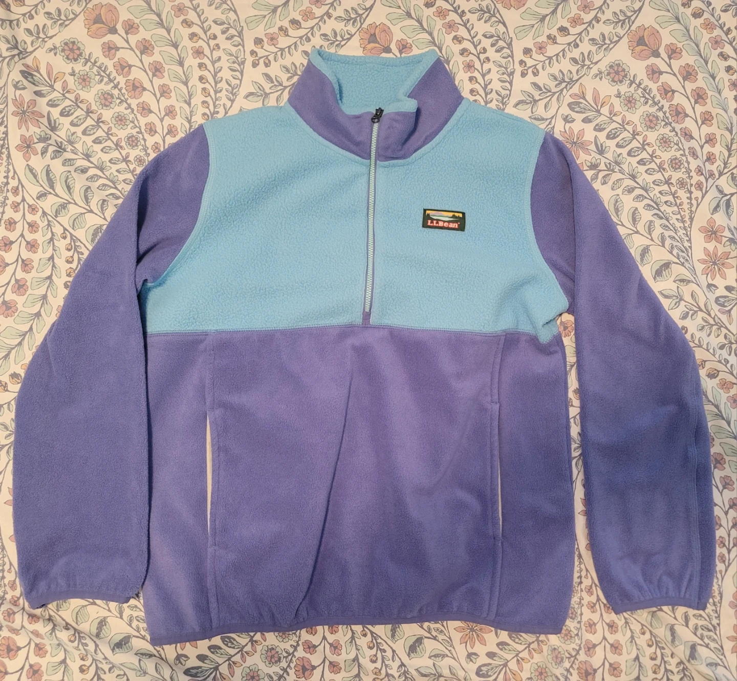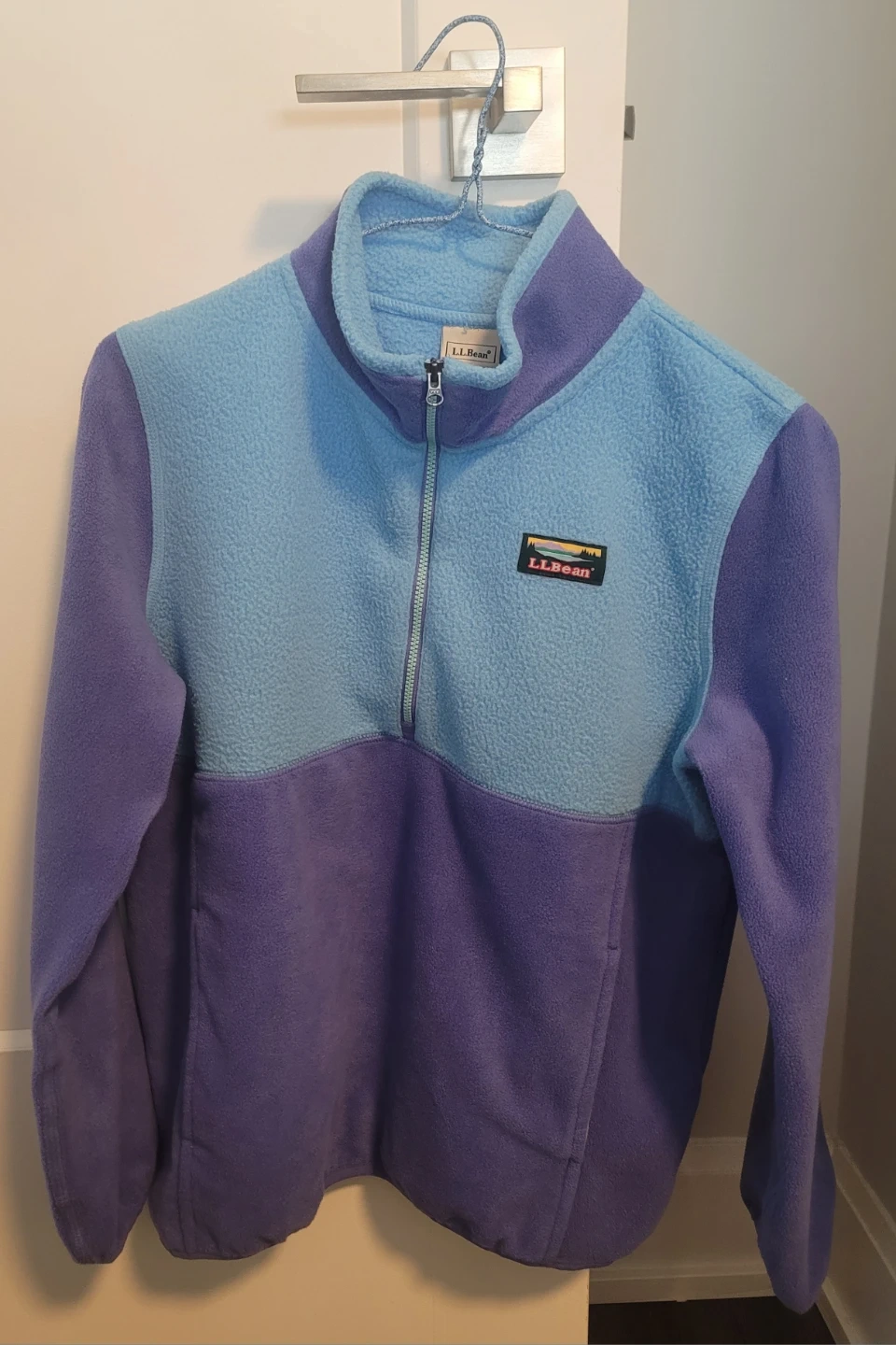 L.L.Bean fleece pullover features a half-zip neckline Two-tone colour block design in purple and light blue