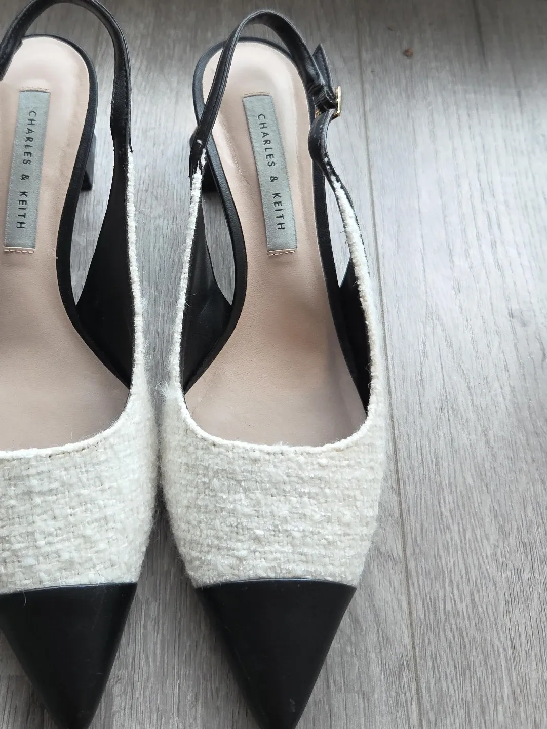 Chic slingback heels from Charles & Keith. Features a tweed fabric upper with a black cap toe and adjustable ankle strap. Perfect for dressing up any outfit!