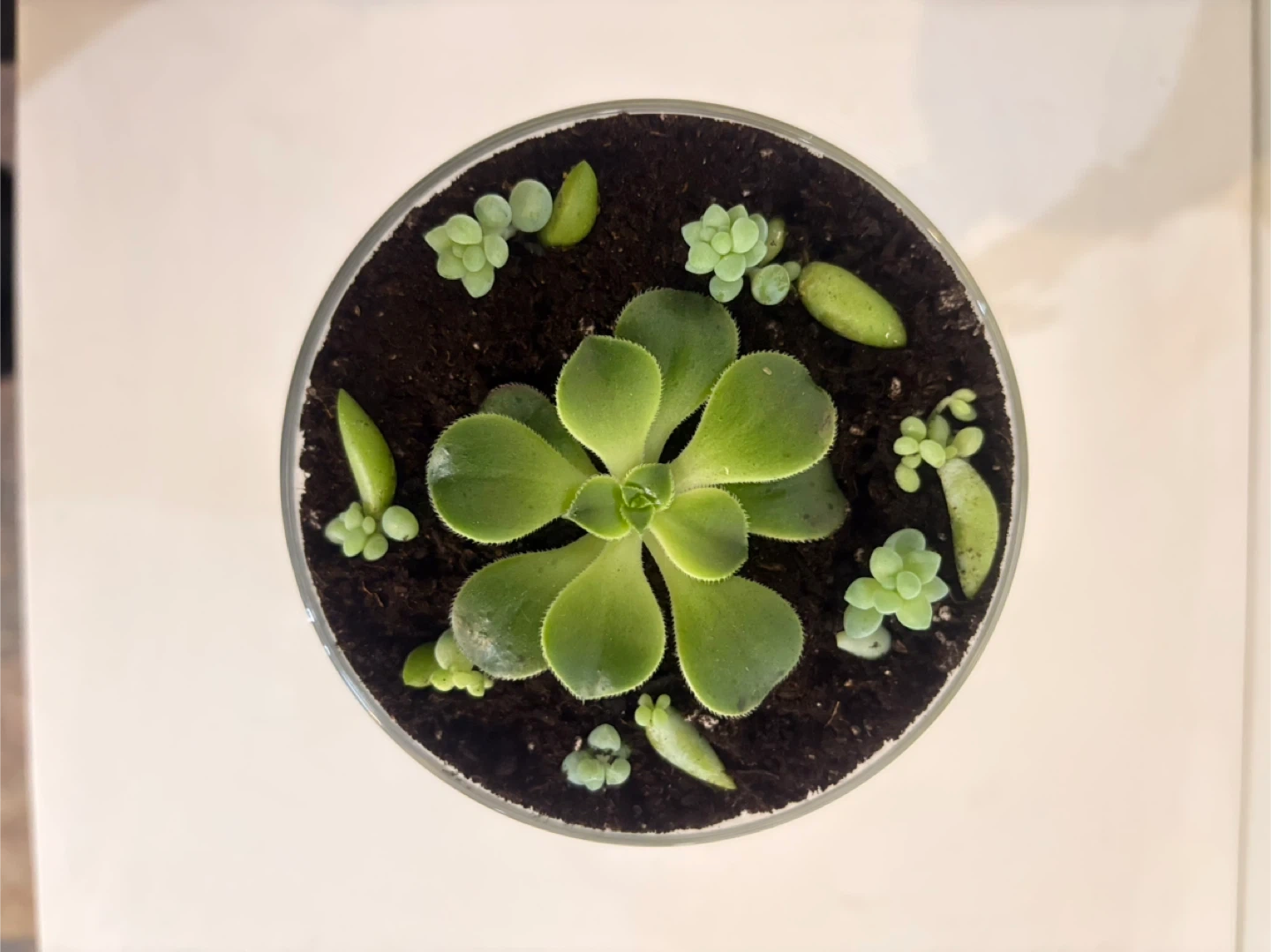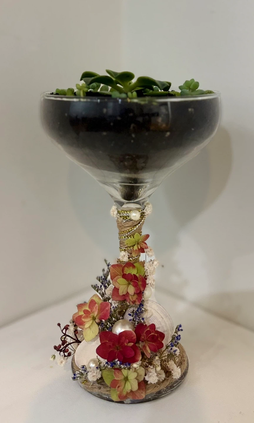 Selling a lovely succulent arrangement in a decorative glass container. It's a unique piece that will add a touch of greenery to any space!