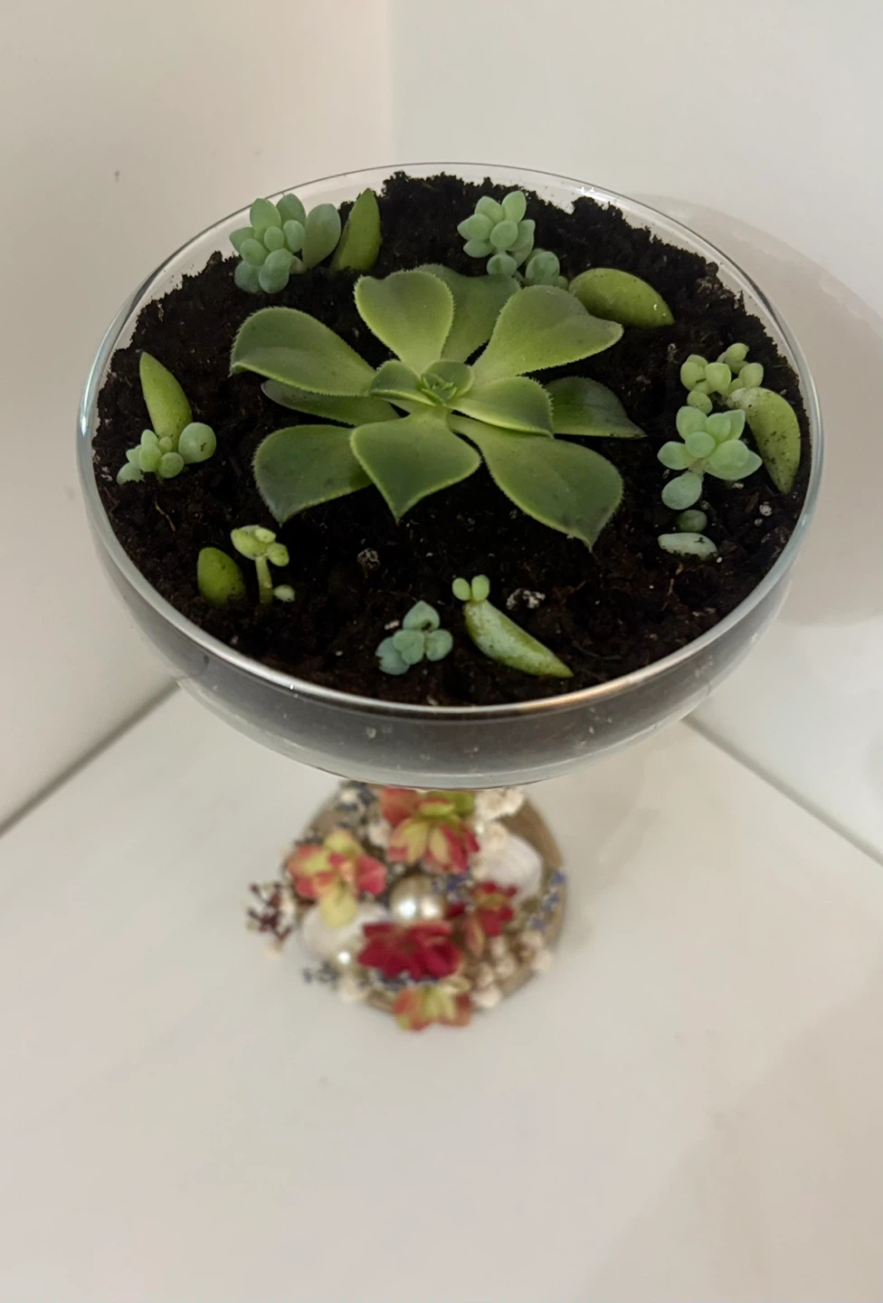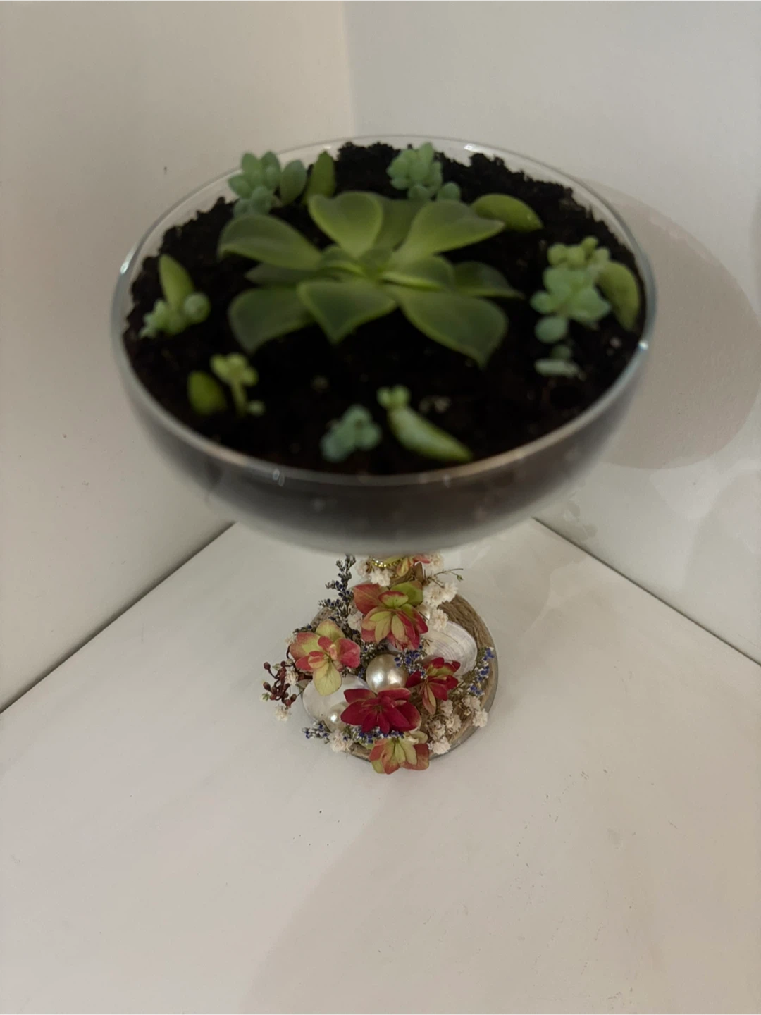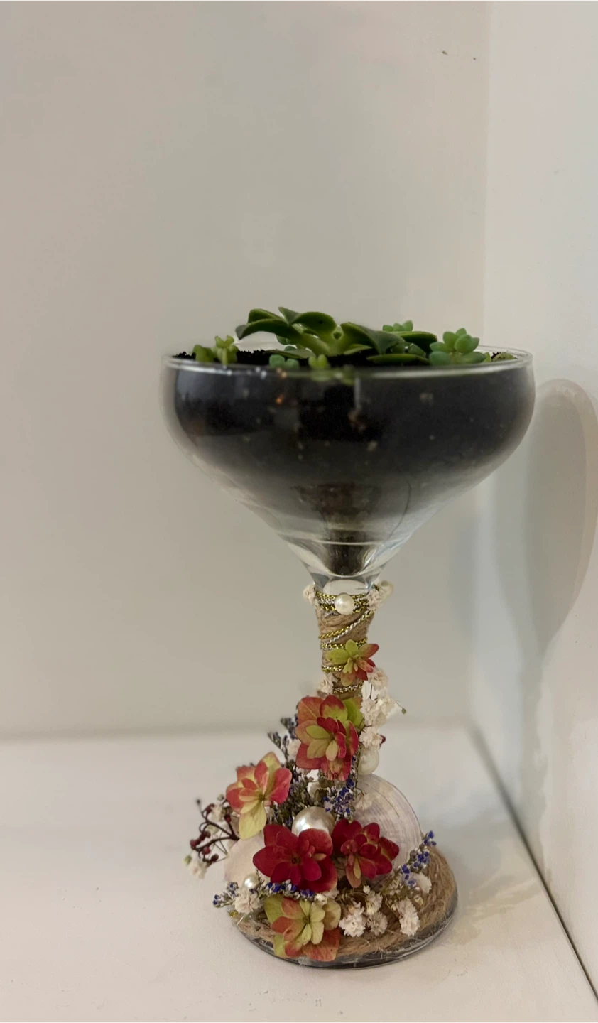 Selling a lovely succulent arrangement in a decorative glass container. It's a unique piece that will add a touch of greenery to any space!
