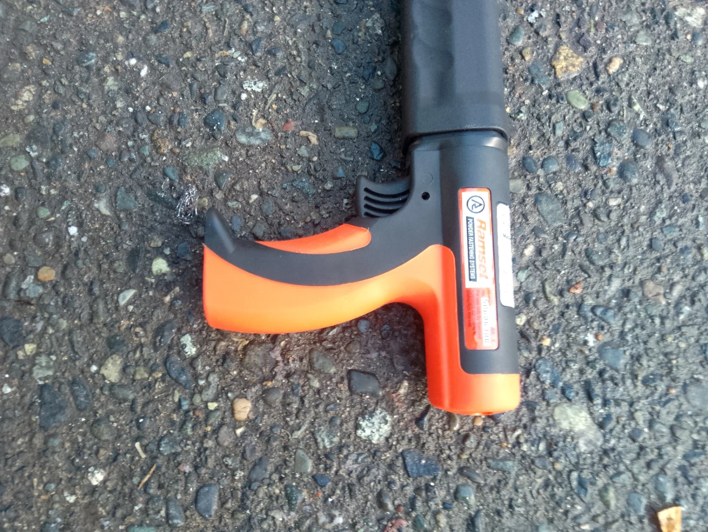 This is a Ramset powder actuated tool. It's designed for fastening concrete and steel together .Wood to concrete or whatever your project consist of. An easy and powerful tool. All you need is the kind of cartrages suitable for the job. Packs a punch with only using one hand. Orange and black handle. Sells at Home Depot for $196. Never been used but was opened at Xmas.
