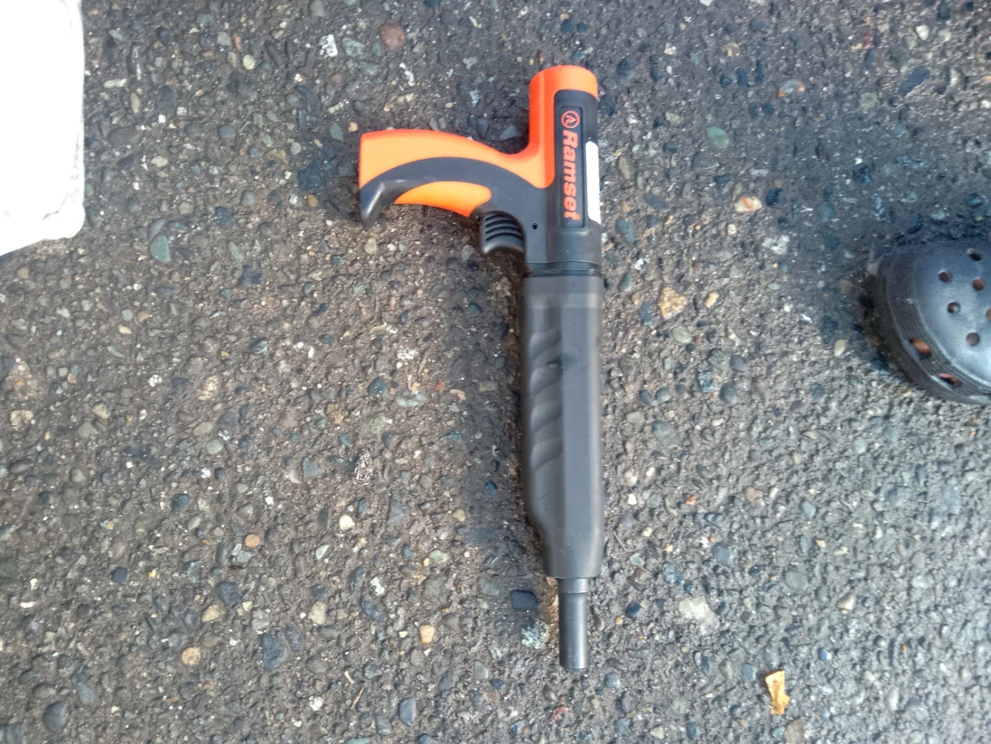 This is a Ramset powder actuated tool. It's designed for fastening concrete and steel together .Wood to concrete or whatever your project consist of. An easy and powerful tool. All you need is the kind of cartrages suitable for the job. Packs a punch with only using one hand. Orange and black handle. Sells at Home Depot for $196. Never been used but was opened at Xmas.