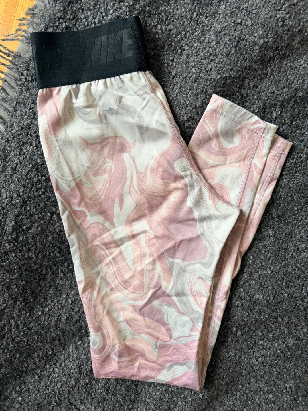 These Nike Dri-FIT leggings for women are size XS and feature a fun pink swirl pattern. They're made with a comfortable and breathable fabric for active days. They offer a snug fit and are great for workouts or casual wear.