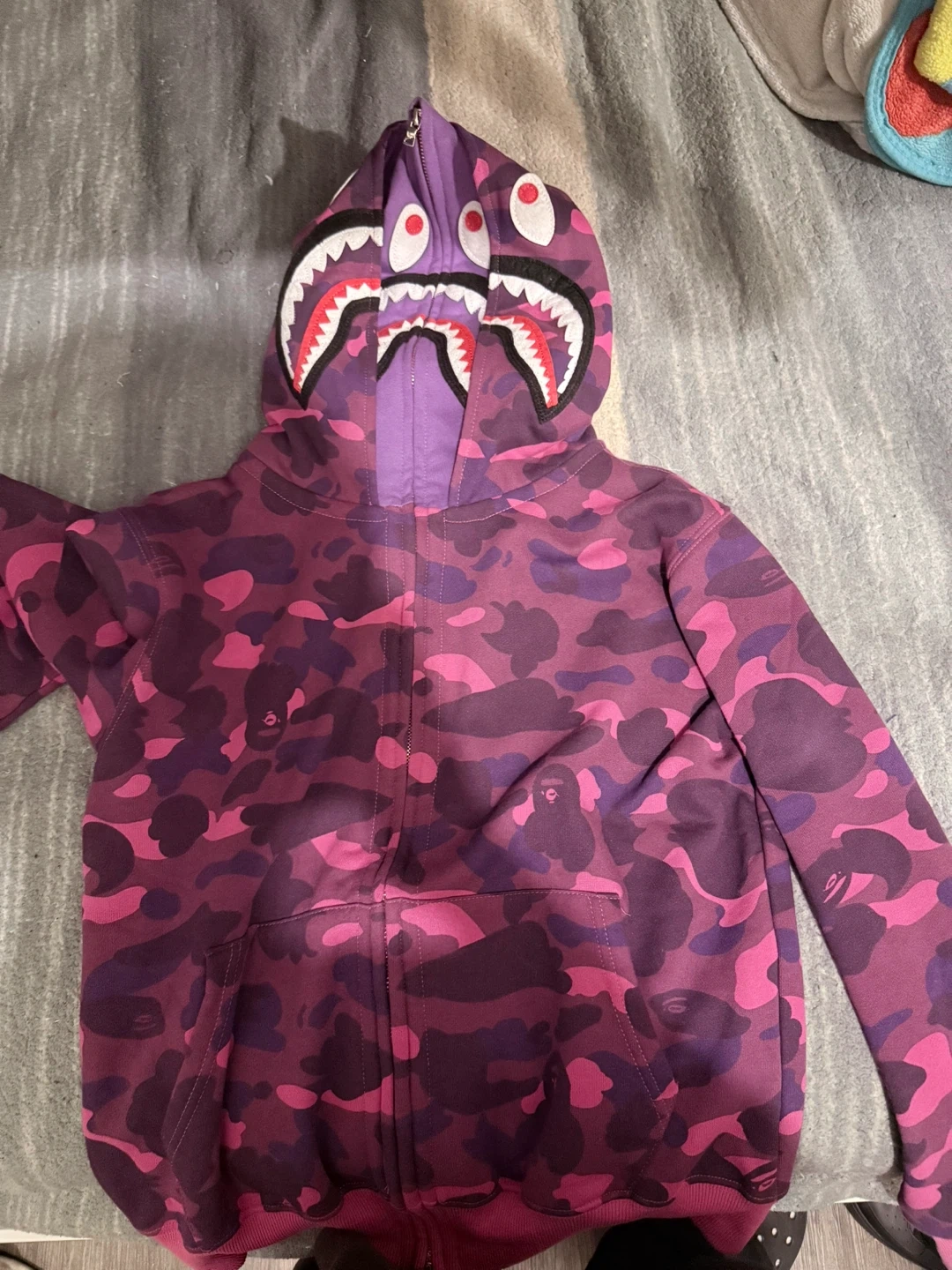 Selling a Bathing Ape (BAPE) full zip-up hoodie in a purple camo print. It features the iconic shark design on the hood. Size is a medium. Great for adding a pop of color and streetwear style to your wardrobe!