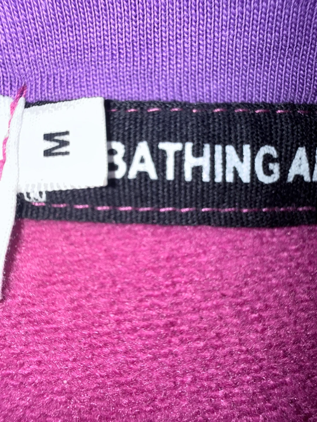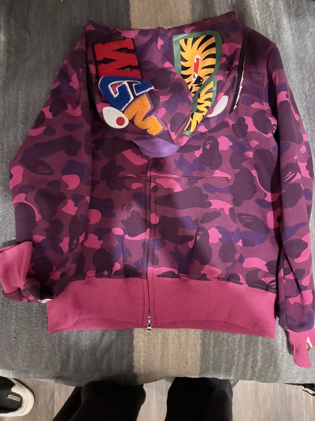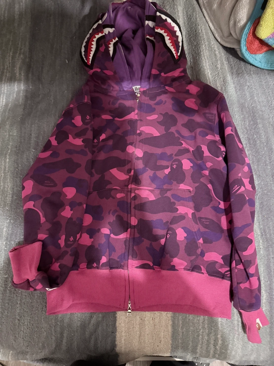 Selling a Bathing Ape (BAPE) full zip-up hoodie in a purple camo print. It features the iconic shark design on the hood. Size is a medium. Great for adding a pop of color and streetwear style to your wardrobe!
