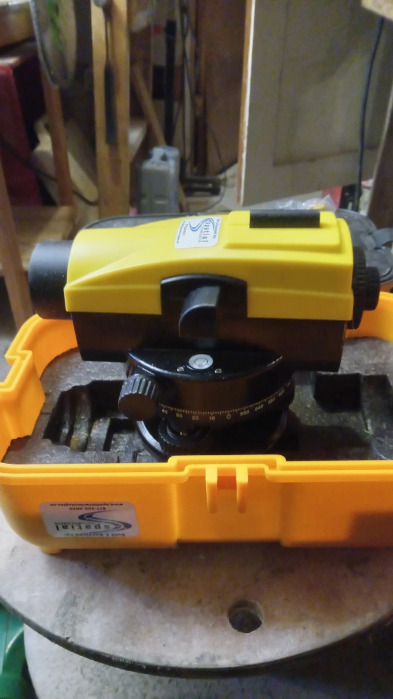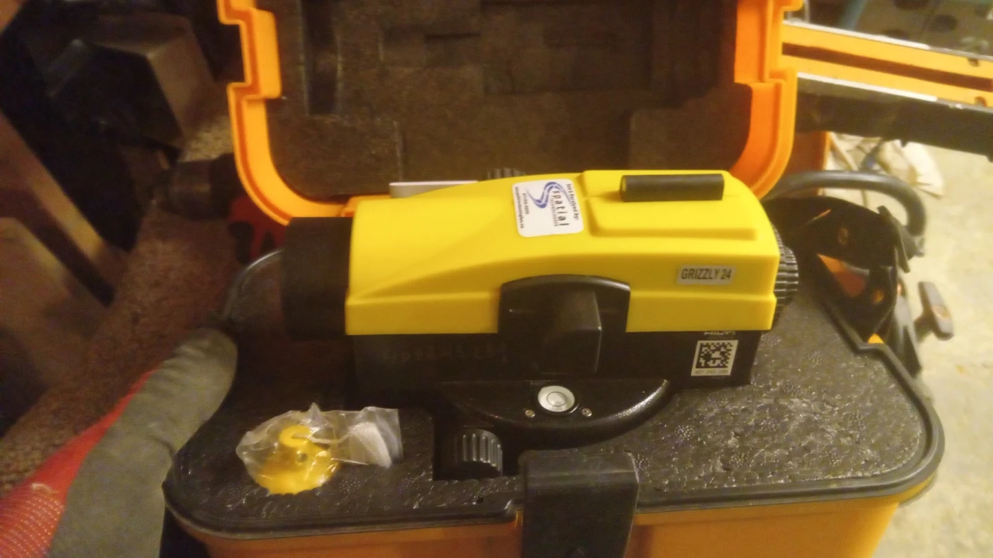 This is a Spatial Grizzly 24 leveling instrument. It's in a yellow and black casing with a durable orange case for transport. Includes all protective foam padding.