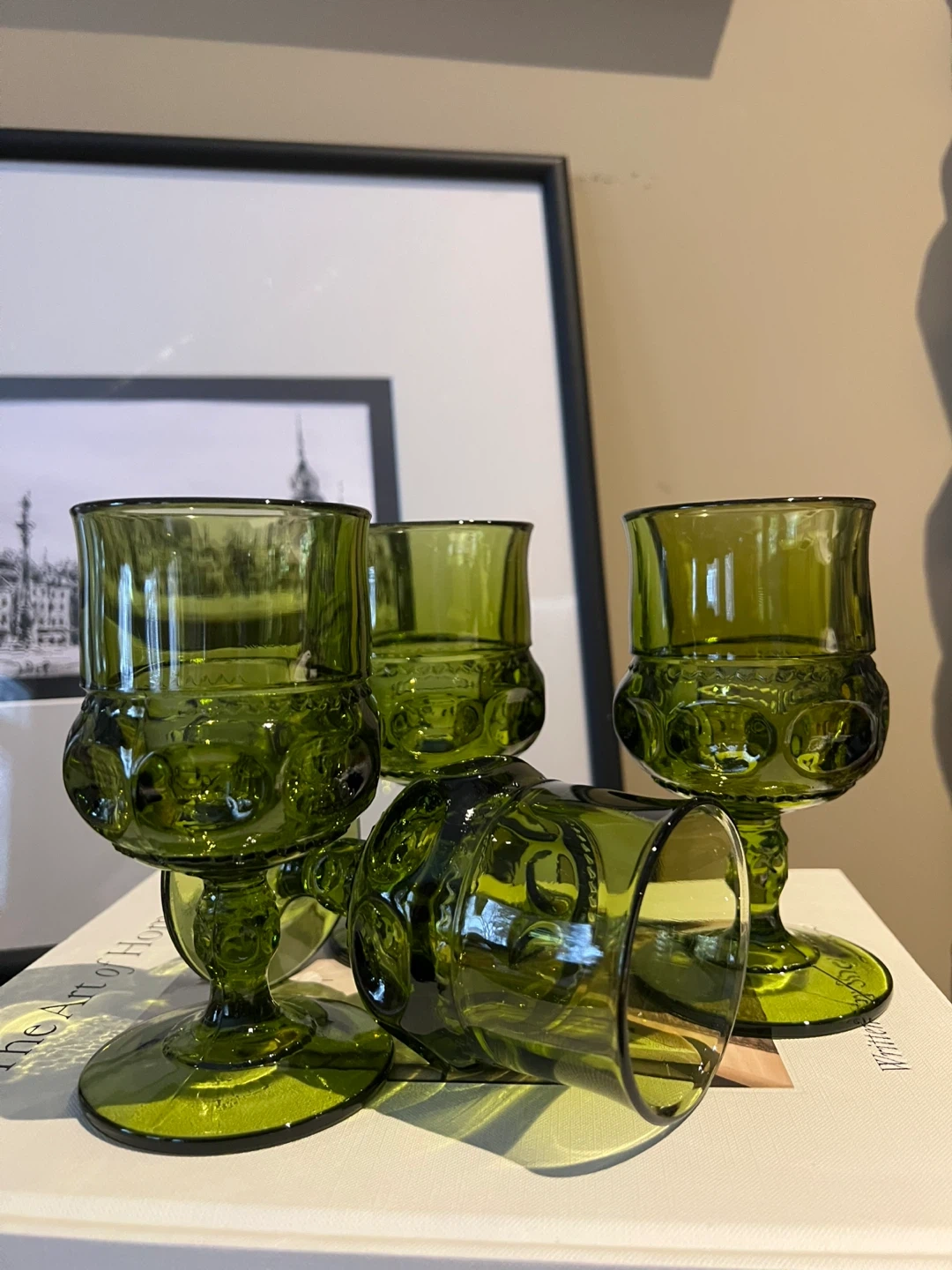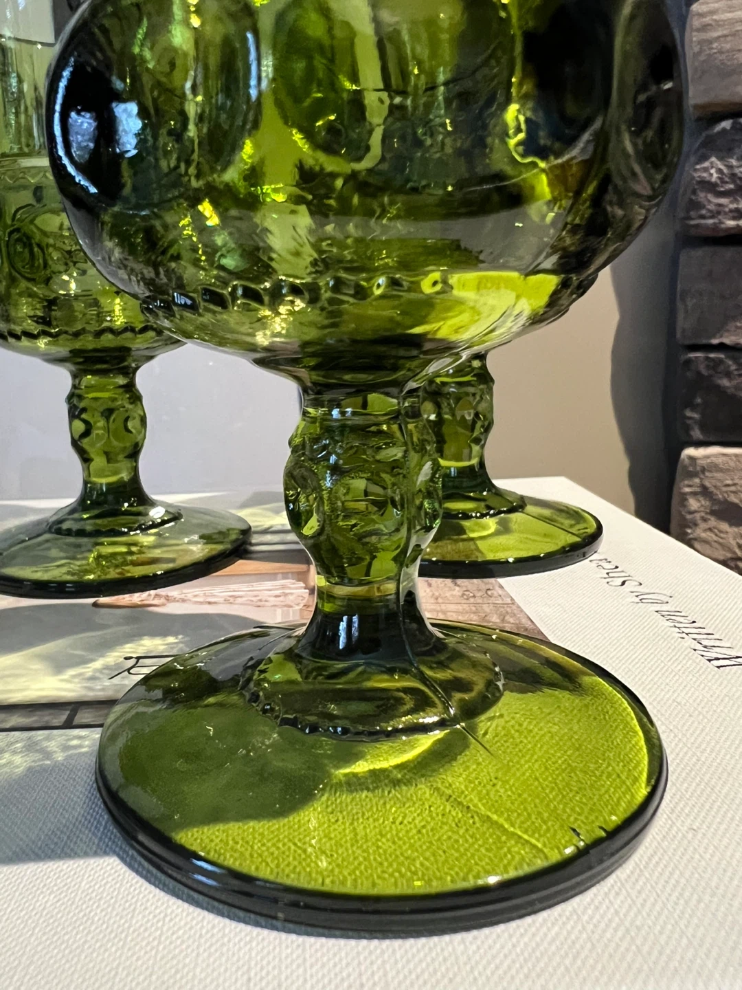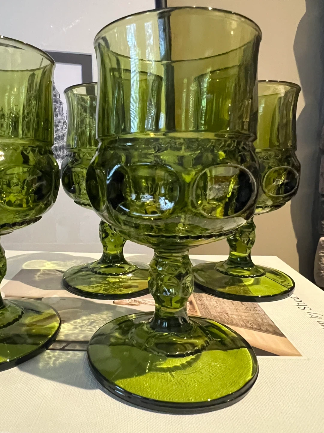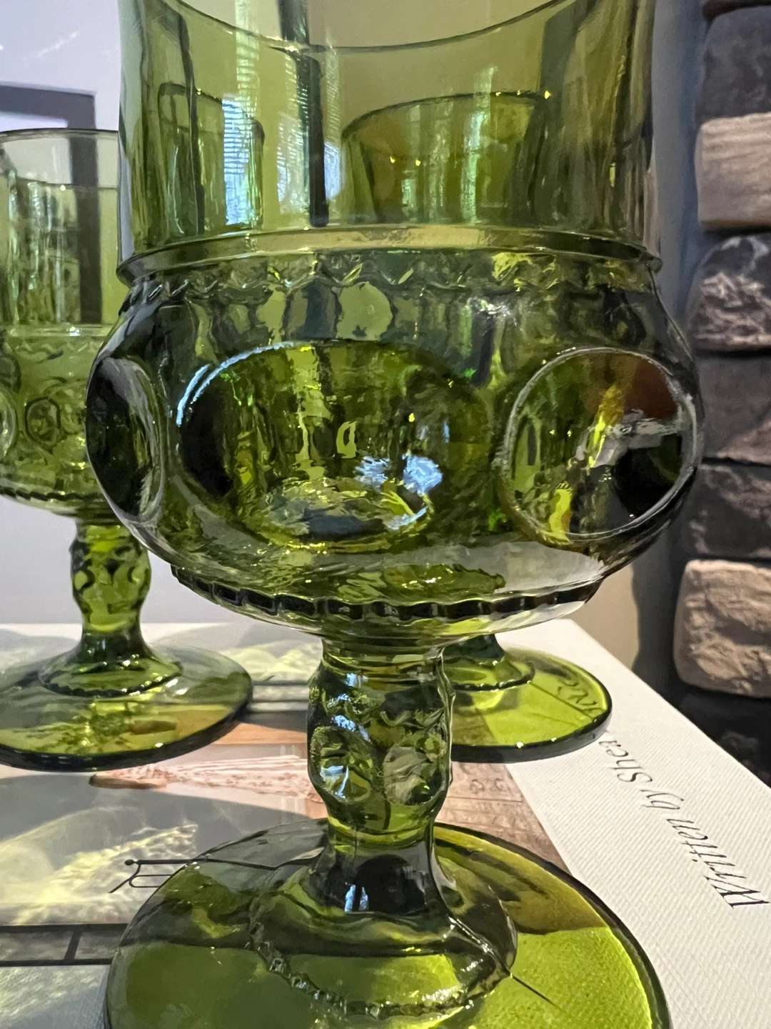 Indiana Glass King's Crown thumbprint goblet in avocado green, a classic mid-century design