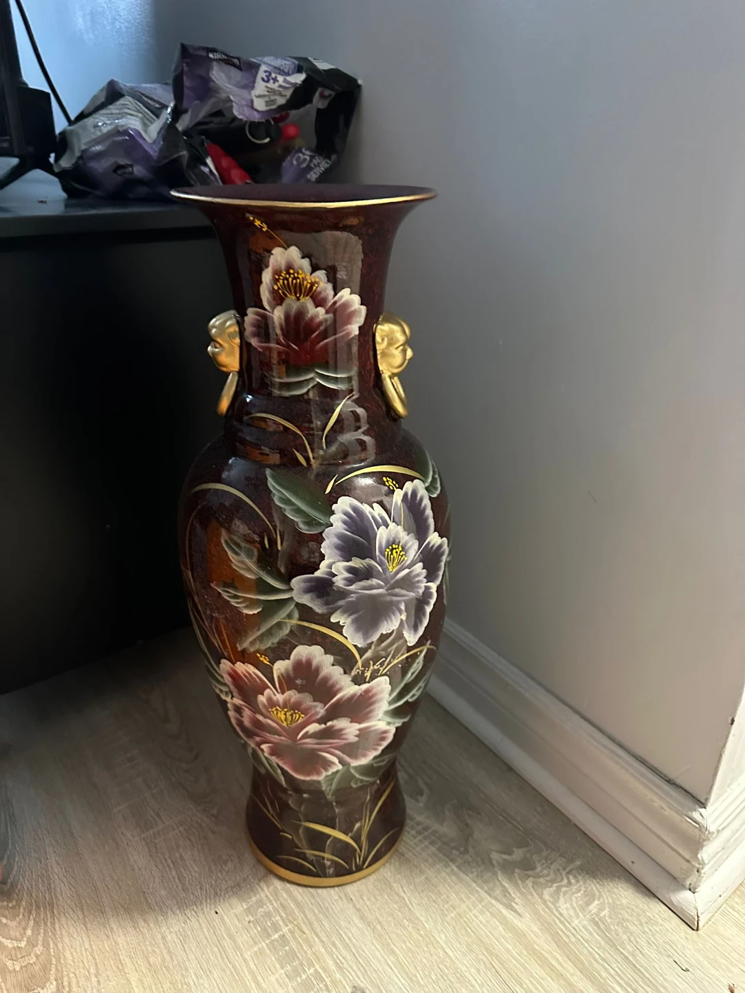 This large ceramic vase features a beautiful floral design with shades of purple, pink, and gold accents. It has gold handles with a unique face design. Adds a decorative touch to any room.Pick up @ Long branch, Etobicoke. Call this number 647 949 2962 now