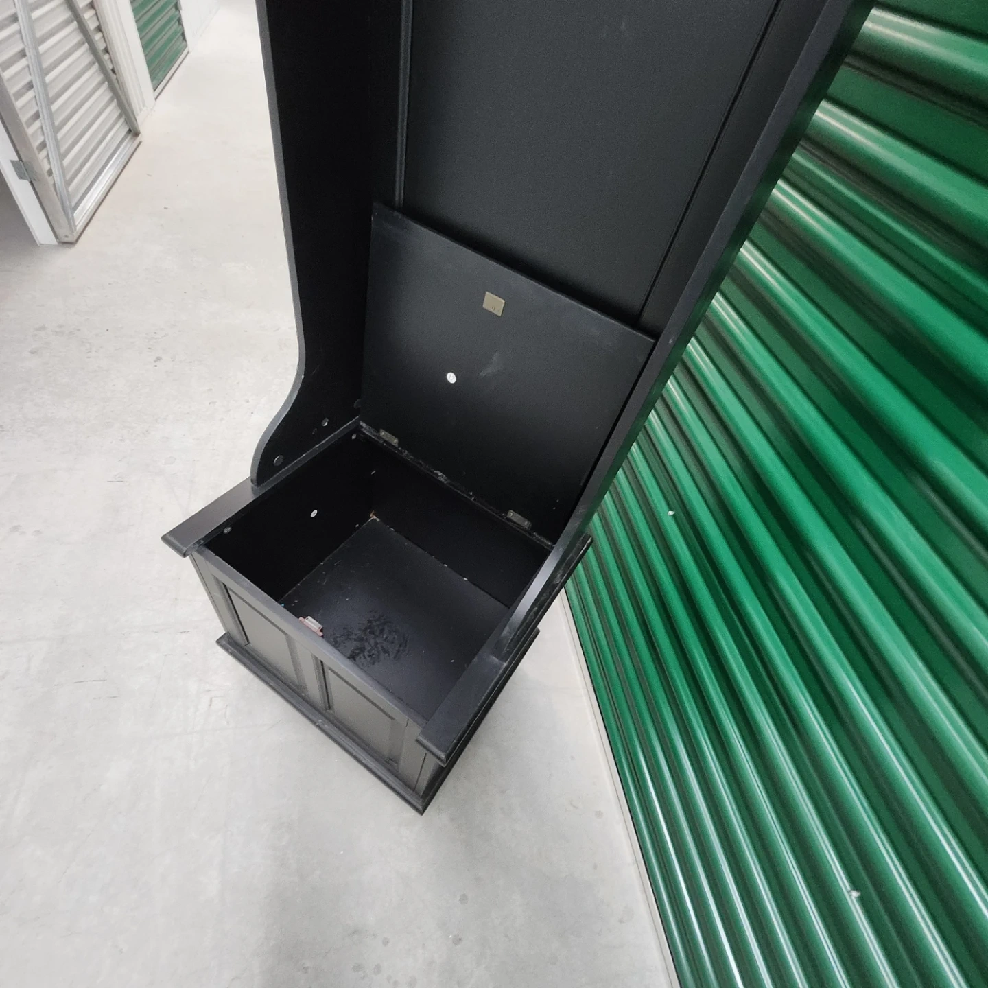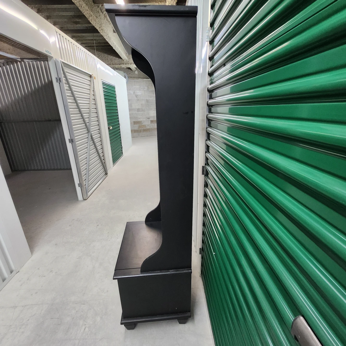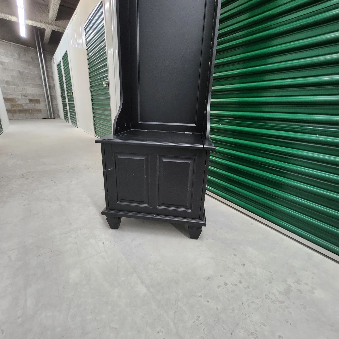 This black hall tree bench offers convenient storage and a place to prepare before heading out. It includes a mirrored top section with coat hooks and a bench seat with a storage compartment underneath. The dark wood finish complements various decor styles.