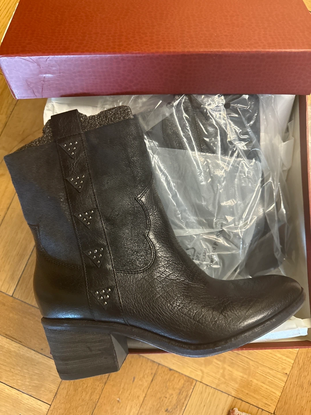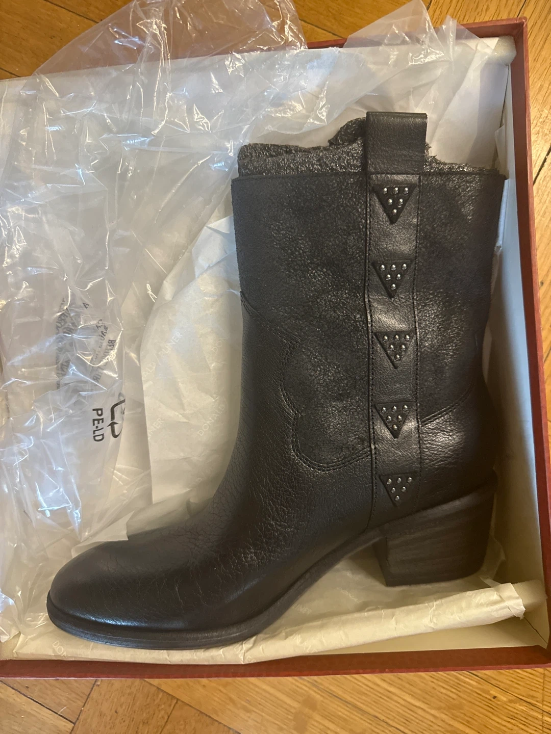 These Donald Pliner ankle boots are in excellent condition (New, never worn) and come with the original box! They are made of black leather and have a stylish design with silver stud details. They are a size 8.