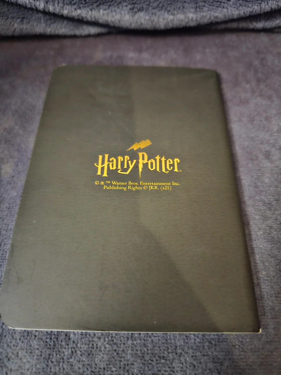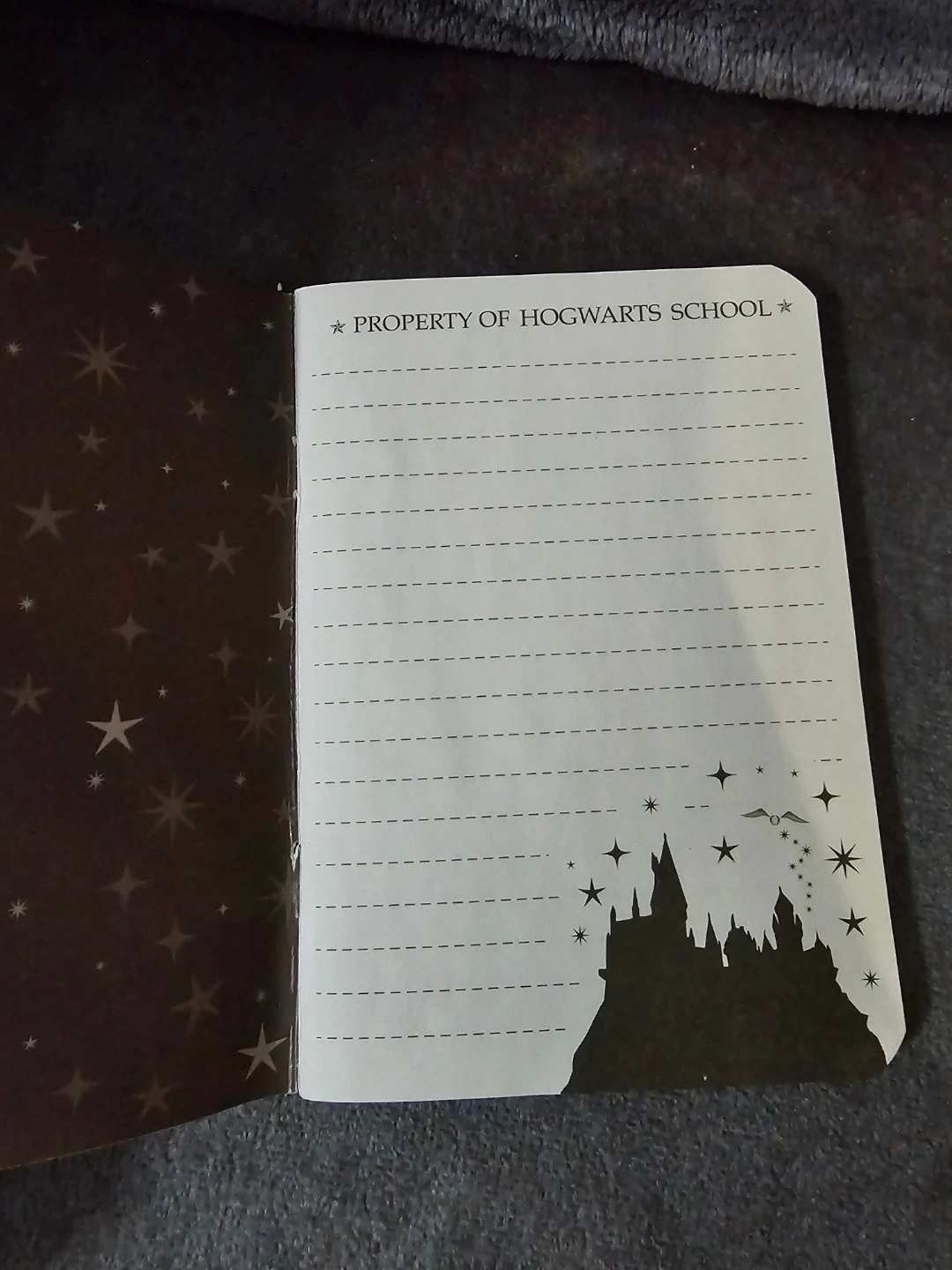 This is a Harry Potter themed notebook. It's black with a gold owl design and "Property of Hogwarts School" printed on the front. The inside pages have lines and a Hogwarts castle silhouette. Perfect for any Harry Potter fan to jot down notes!