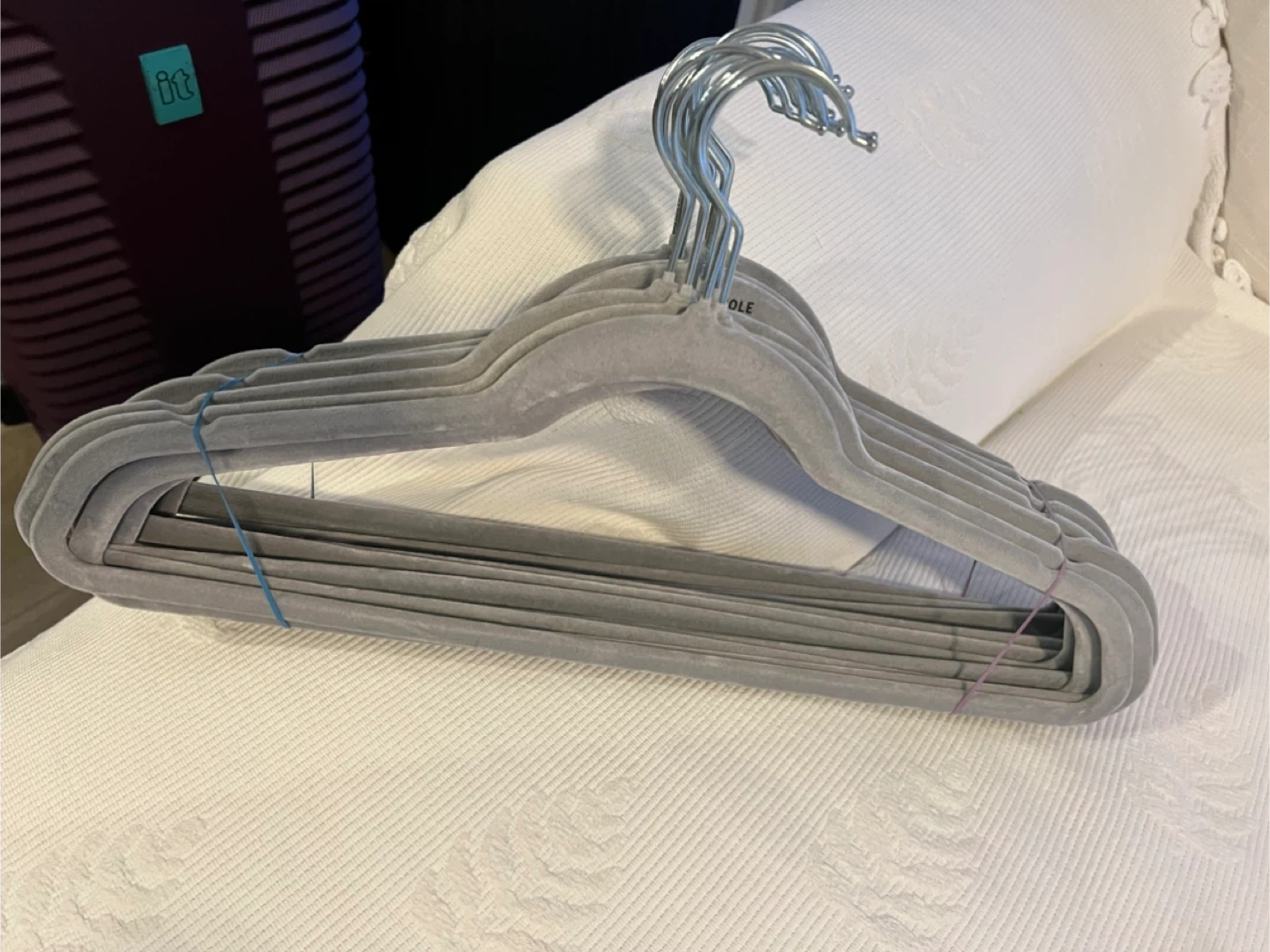 These grey velvet hangers are designed to keep clothes from slipping off. They're a great space-saver for your closet. They come with a durable metal hook. This set includes 17 hangers each colour.
