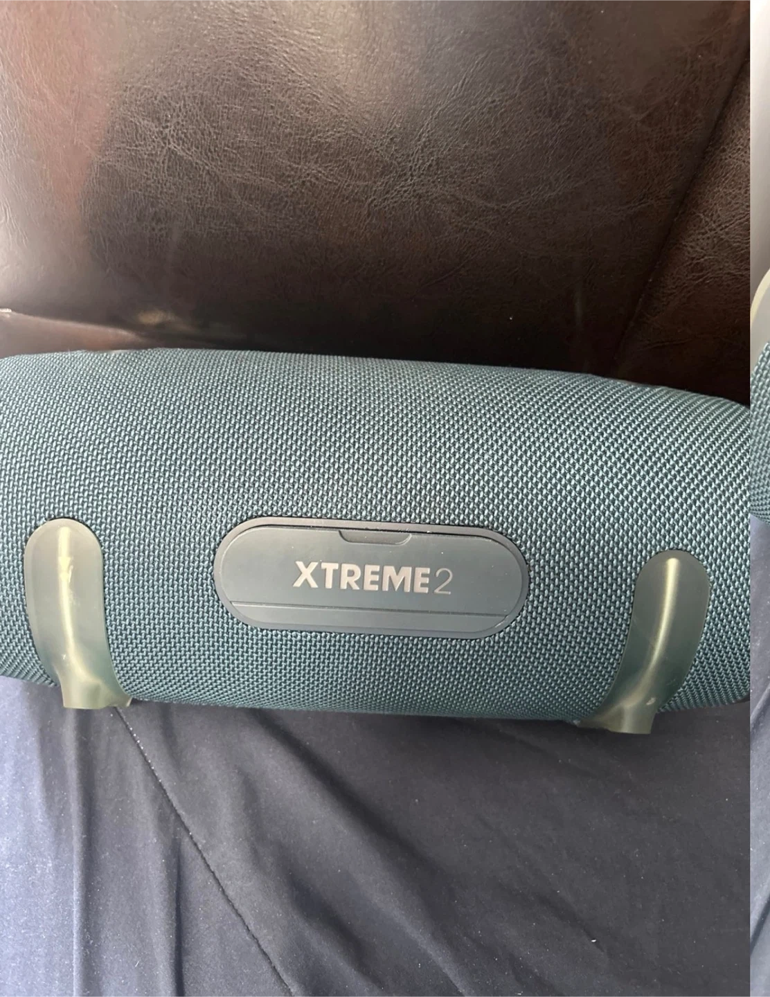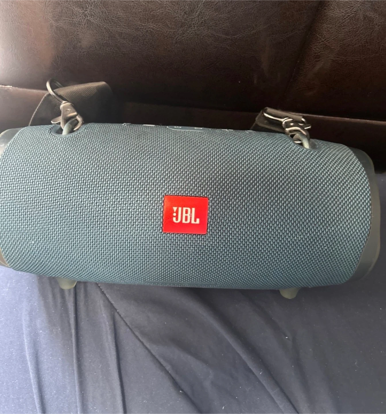 This is a JBL Xtreme 2 portable Bluetooth speaker. It's a teal color and features a durable fabric design. Includes a shoulder strap for easy carrying.