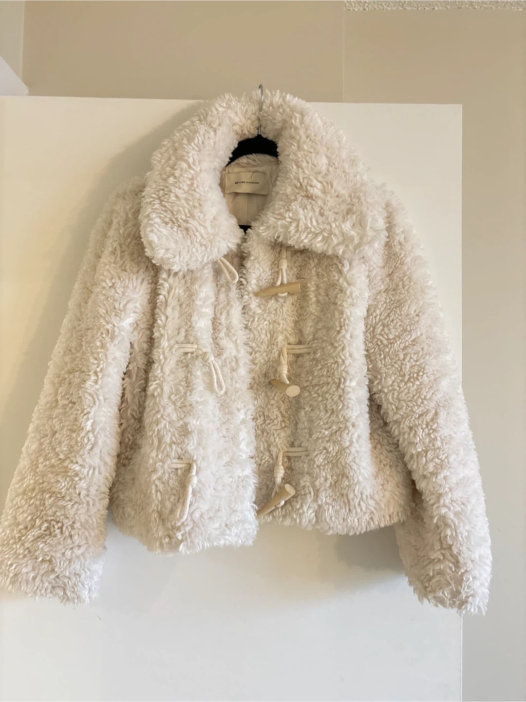 Creamy white fluffy teddy coat from Renee Hand-On. Features toggle button closure and cozy sherpa-like material. Adds a warm, stylish touch to any outfit!