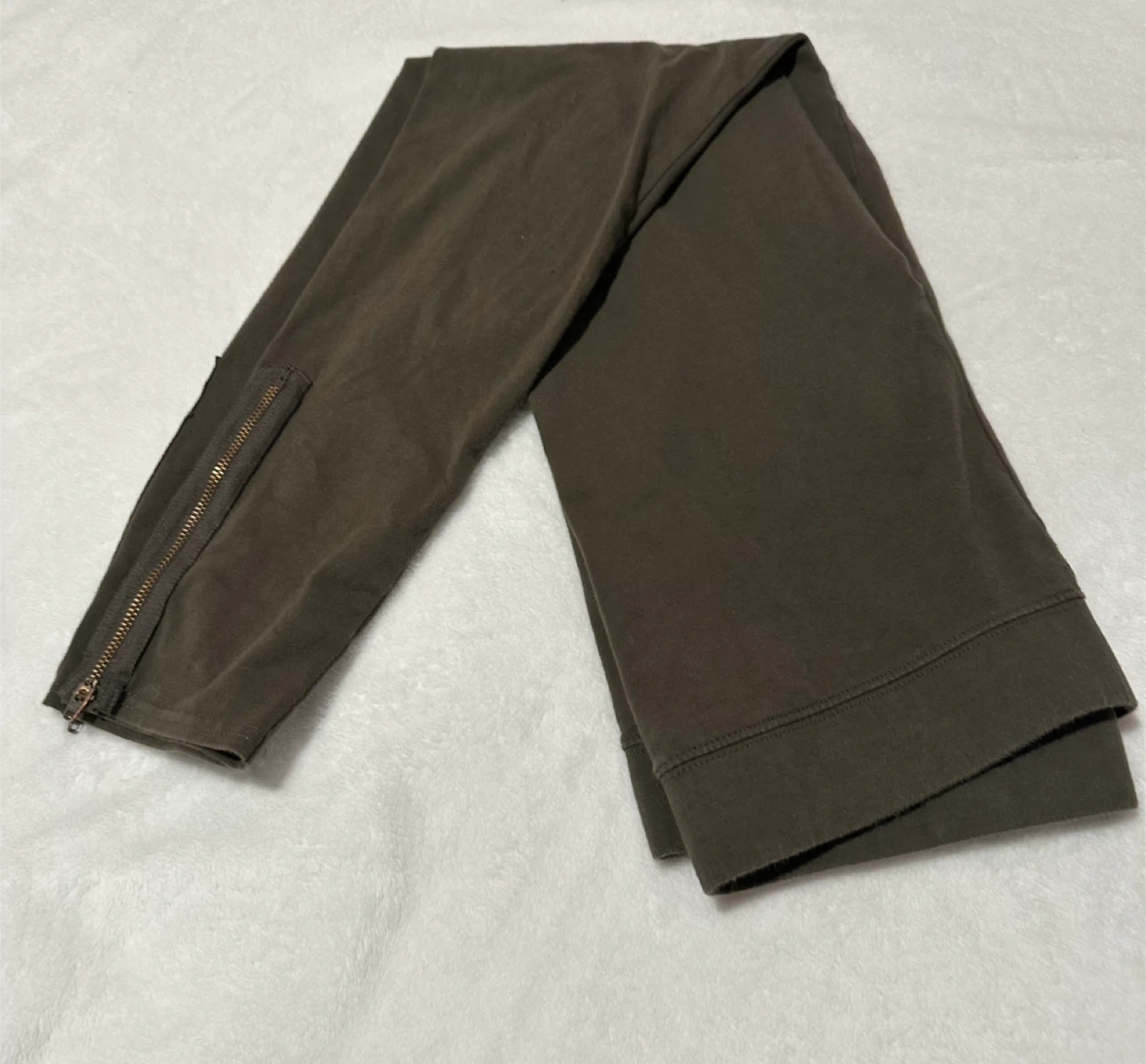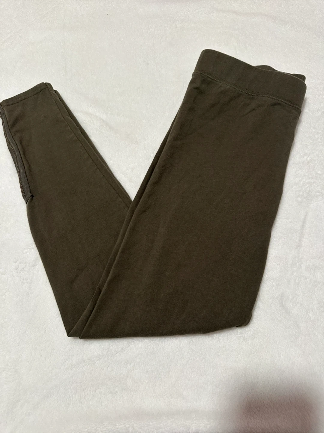These American Eagle Outfitters leggings are a size medium. They're olive green with zippered ankles. Made from a cotton and elastane blend for comfort.