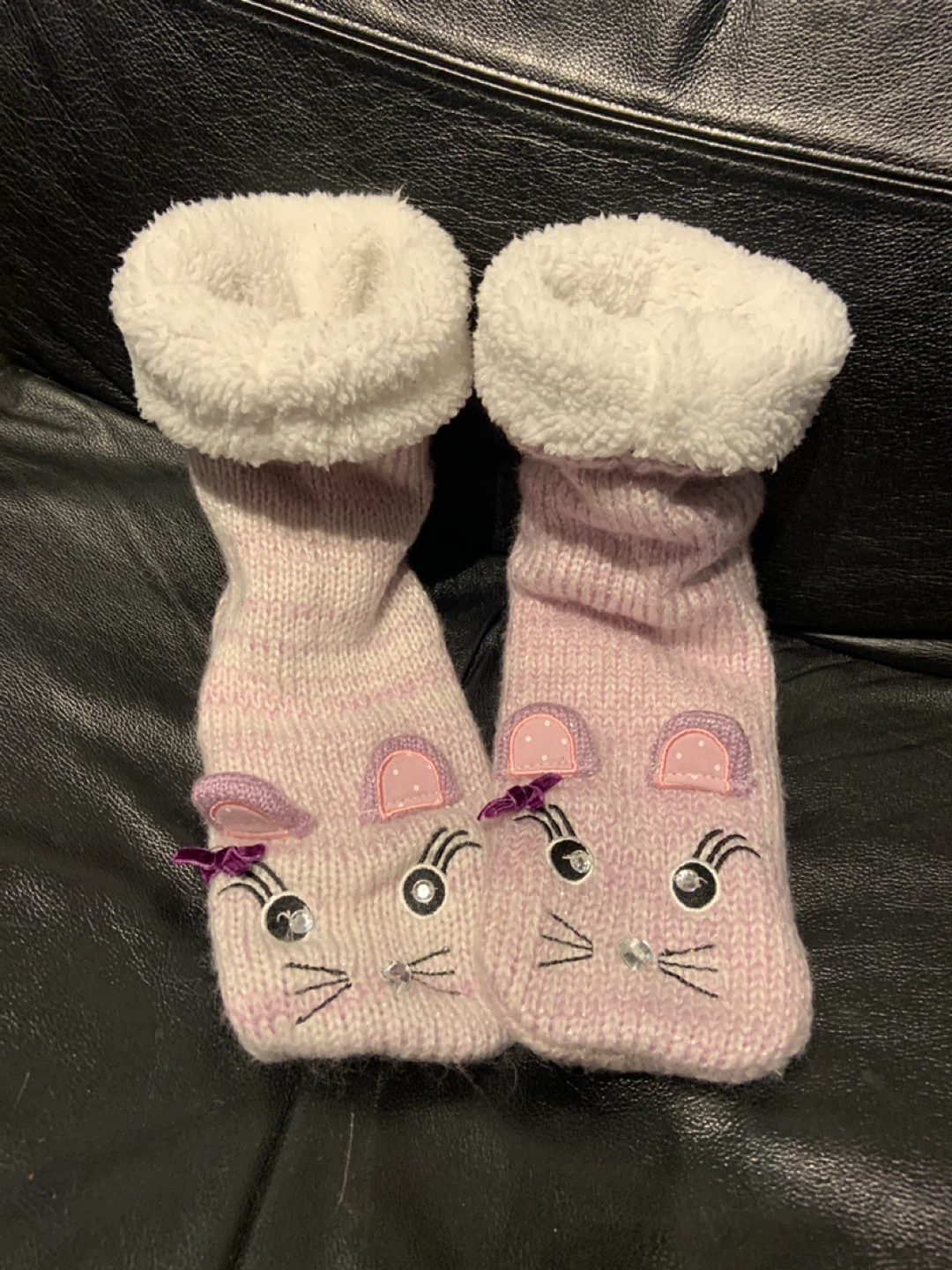 Keep your feet toasty with these super soft, sherpa-lined socks. They feature a cute cat face design with little ears and bows. Perfect for lounging around the house in a cold winter day.