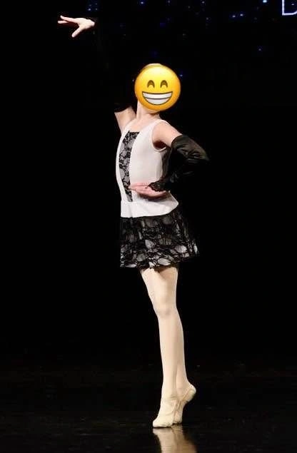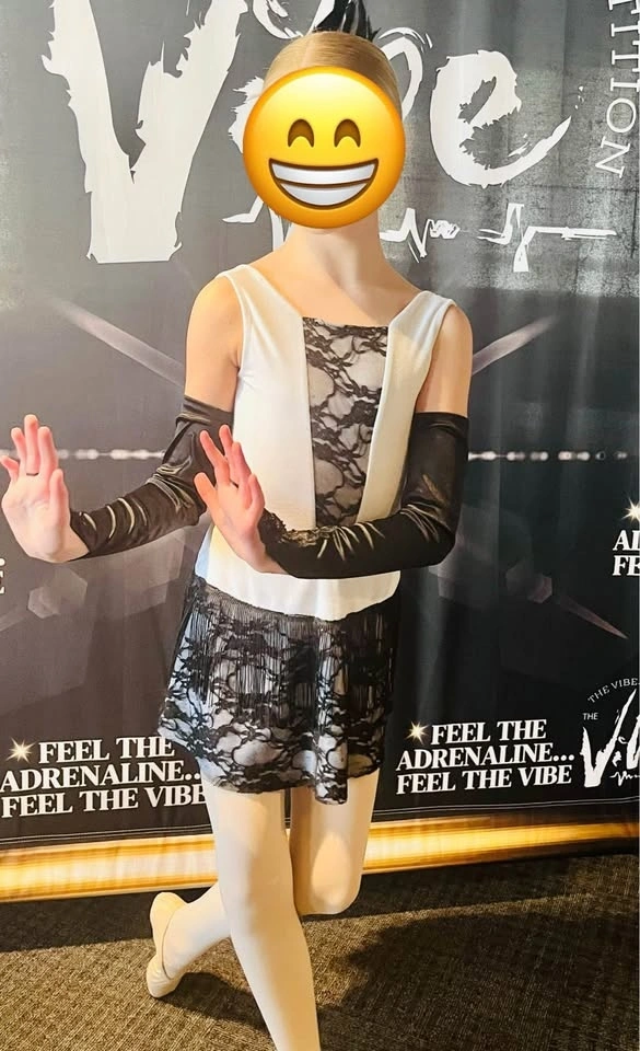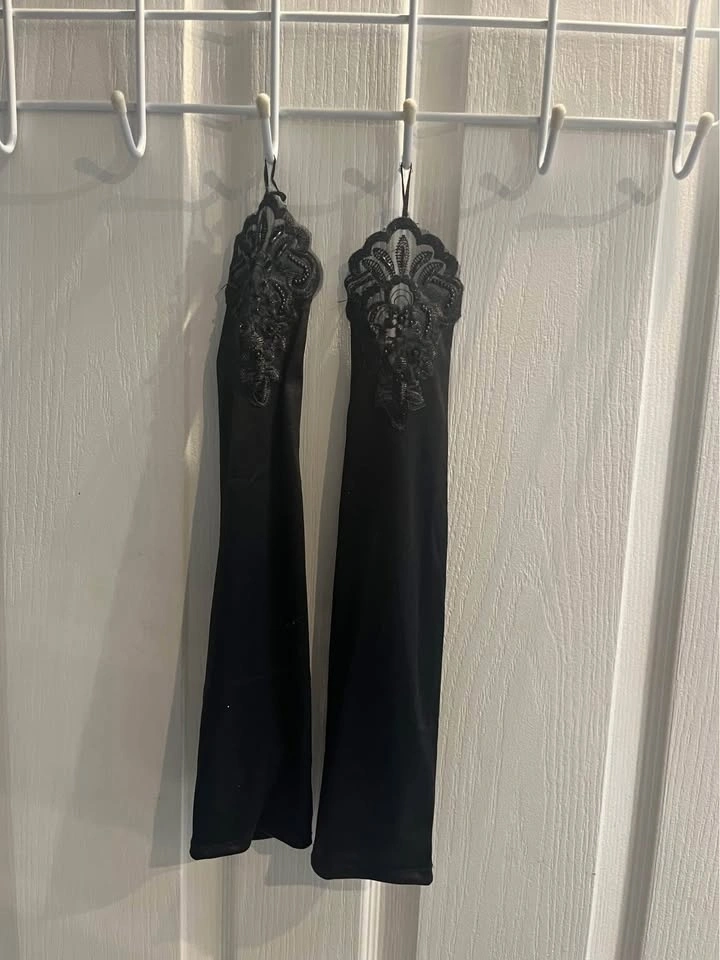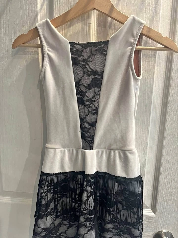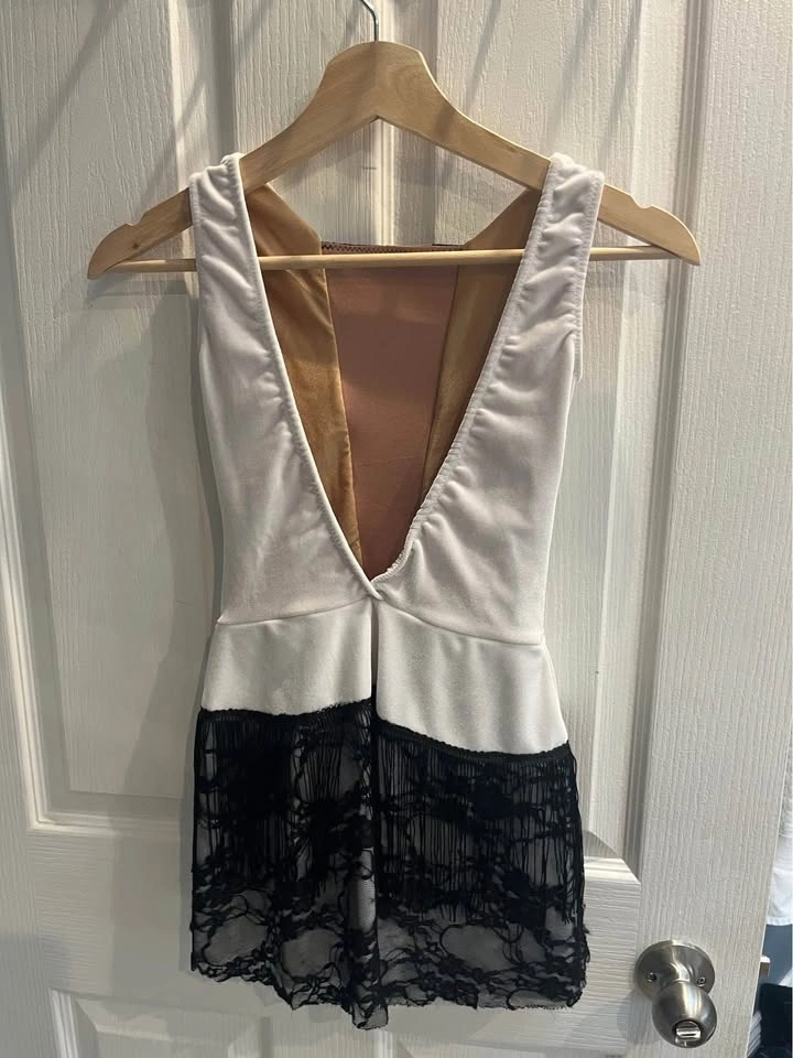 Ballet dress used for a Charleston style ballet dance. Custom-made, likely size Medium Child to Large Child. Worn by a tall-average 11-year-old. Includes long black gloves with lace detail. The headpiece is missing.