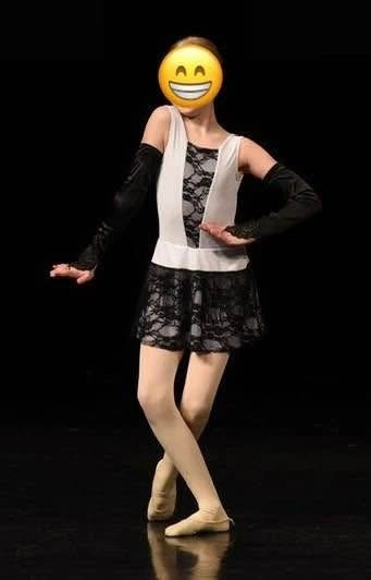 Ballet dress used for a Charleston style ballet dance. Custom-made, likely size Medium Child to Large Child. Worn by a tall-average 11-year-old. Includes long black gloves with lace detail. The headpiece is missing.