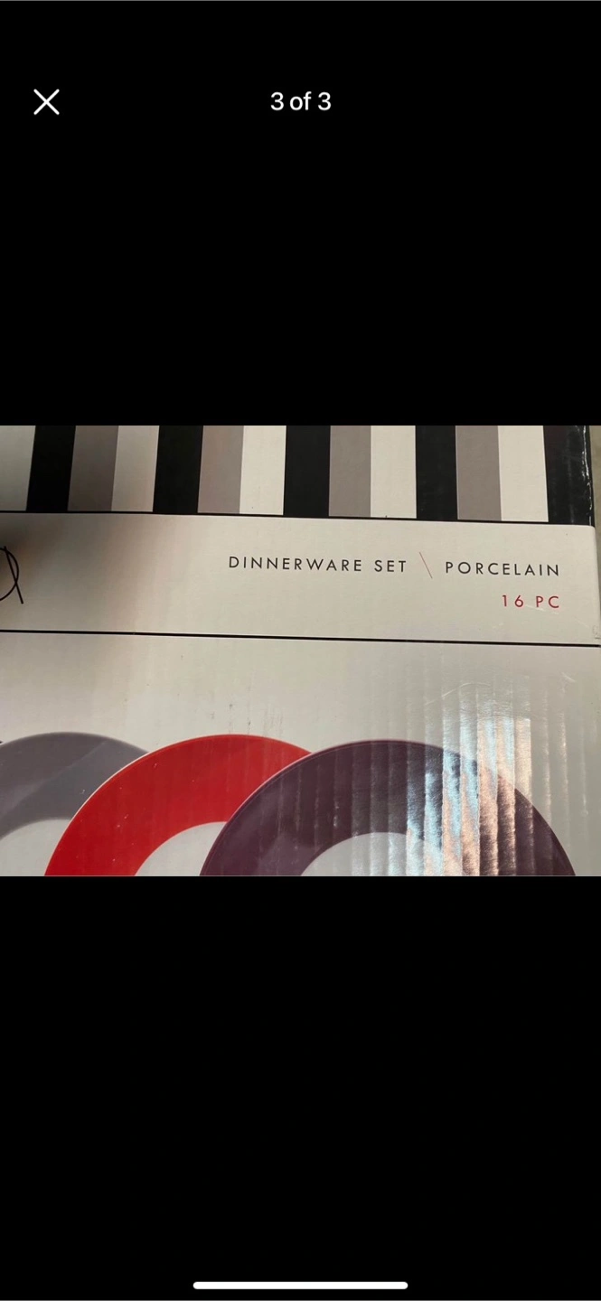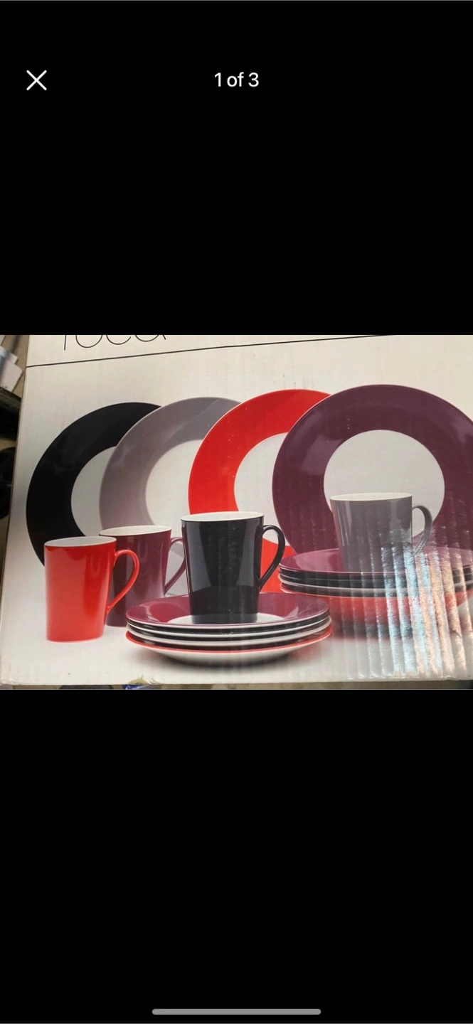New in box. 16-piece porcelain dinnerware set. Features red, black, and grey colours. Includes dinner plates, salad plates, mugs, and cups.