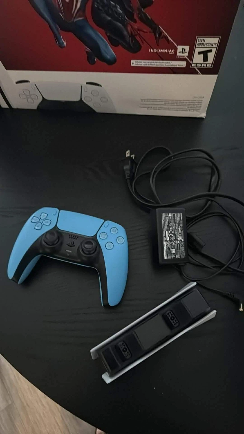 Disc PS5 with 2 controllers (white and light blue) and a 2 controller dock charger. Does not come with the game. Still have the box. Works perfectly but I don’t use it too often. Feel free to message if you have any questions!