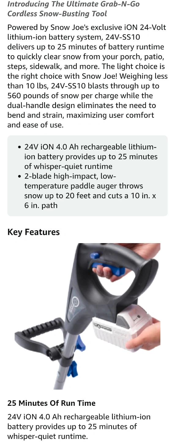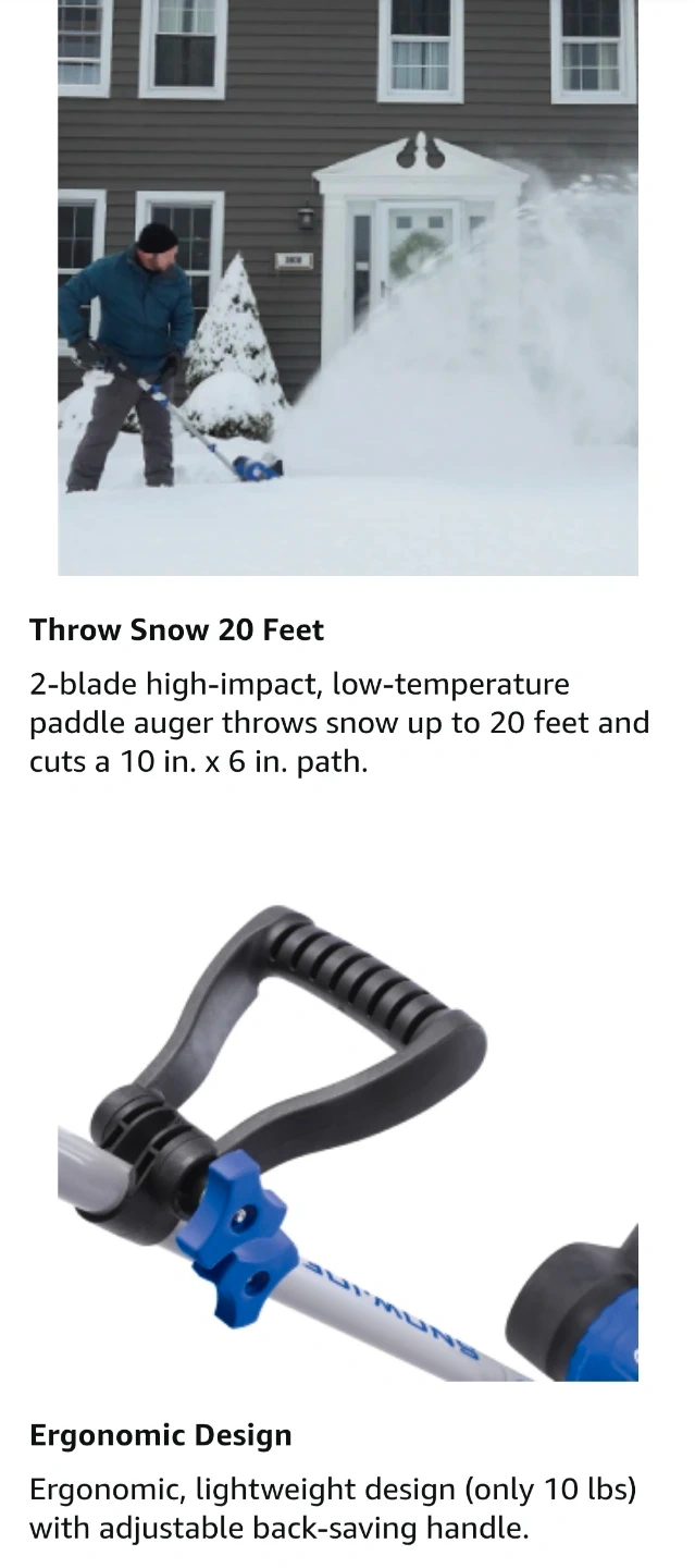 I'm selling a Snow Joe 24V cordless electric snow shovel, a lightweight and portable solution for clearing snow from your deck, patio, or driveway. This tool features a 10-inch clearing width and a 210W motor, making snow removal quick and easy. It runs on a 24V 4Ah battery and includes a charger.