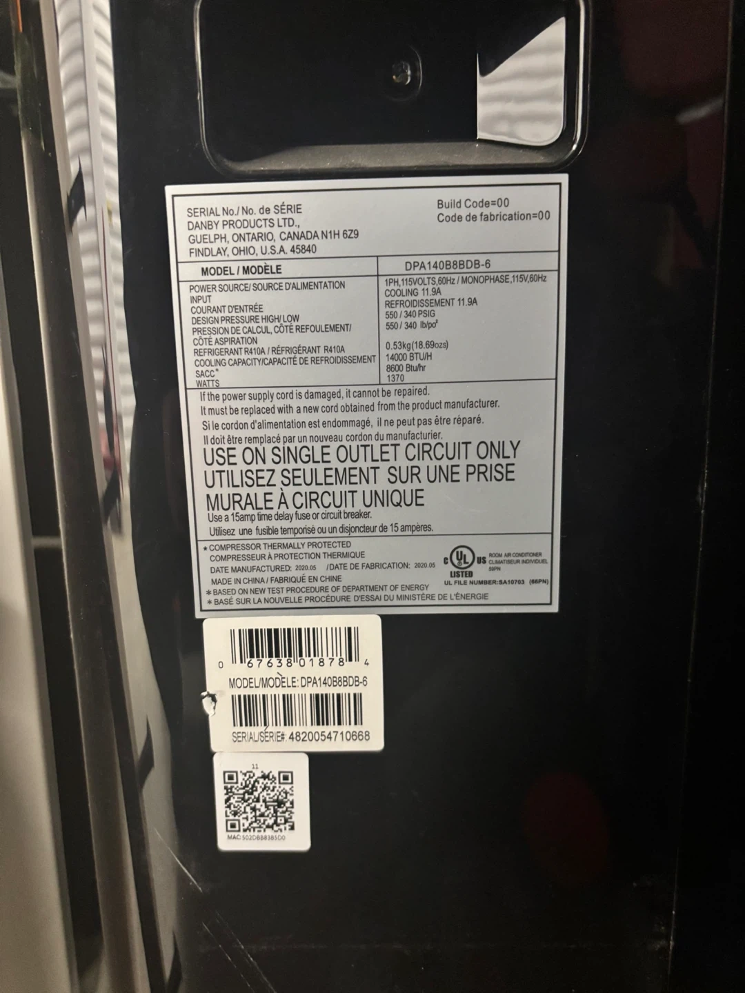 Selling a Danby portable air conditioner, model DPA140B8BDB-6. It's in good working condition and ready to keep you cool this summer! It uses refrigerant R410A and has a cooling capacity of 14000 BTU/H. Date Manufactured: 2020 May 06