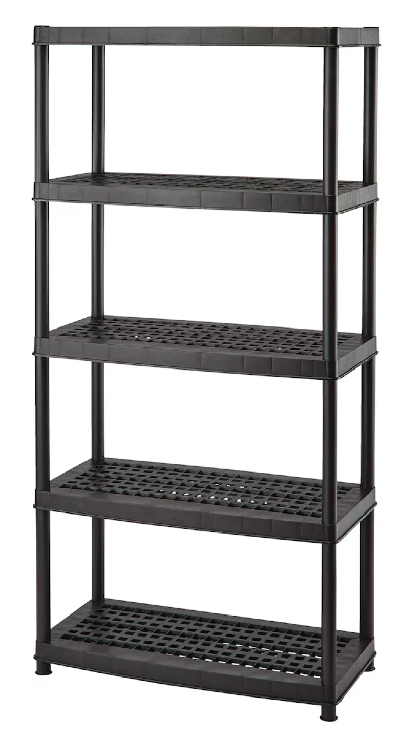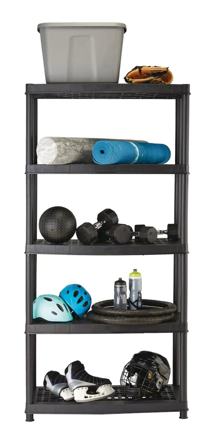 This durable plastic storage unit has five shelves for organizing your space. Black colour. Easy to assemble, it's great for garages or workshops. Measures approximately 73.6" H x 17.7" W x 36”L.