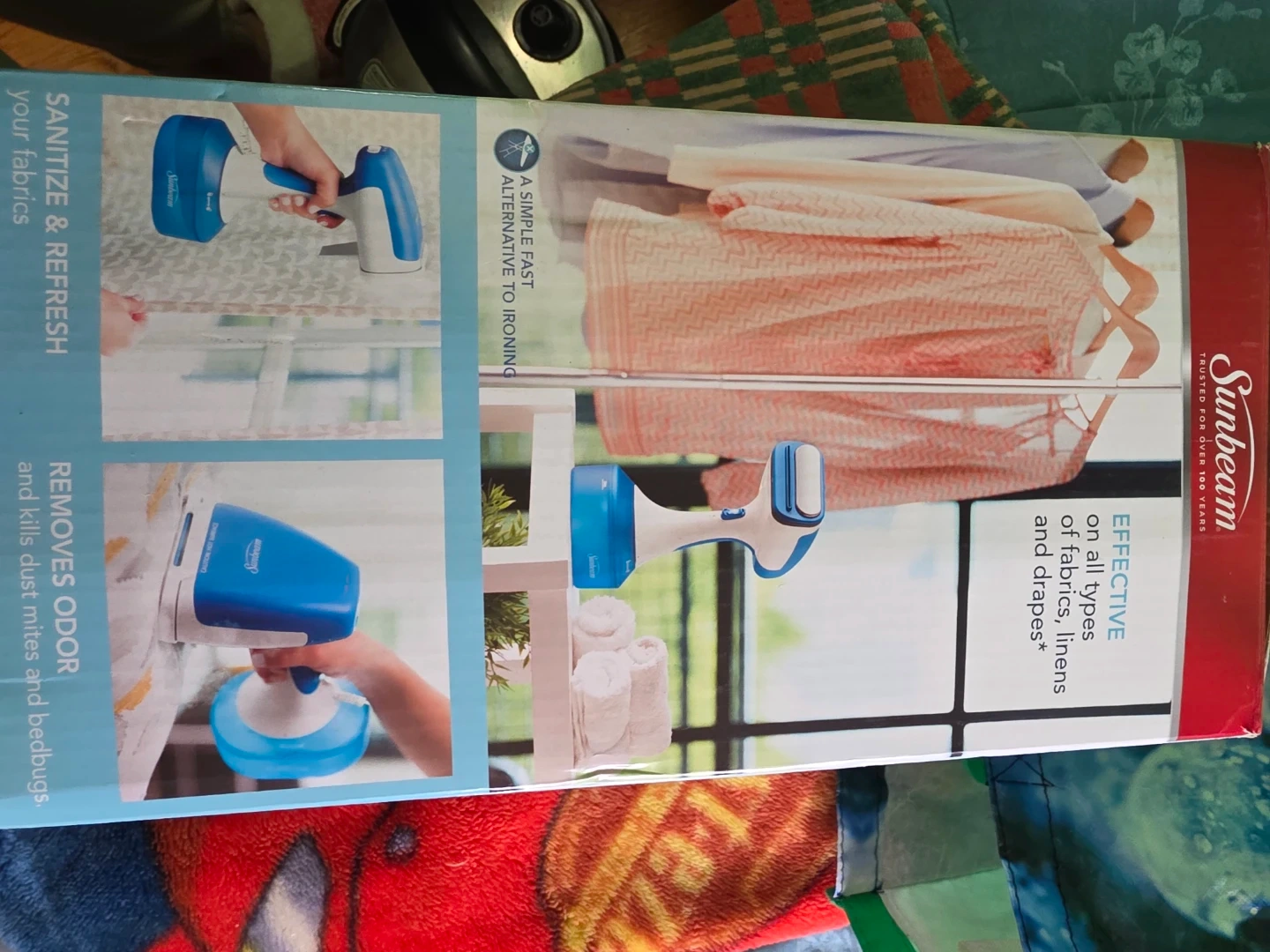 Sunbeam Power Steam fabric steamer. It's quick and easy to use, ready in less than 45 seconds. Offers 15 minutes of continuous steam for faster results. Effectively sanitizes and refreshes fabrics, removing odour and killing dust mites and bedbugs.