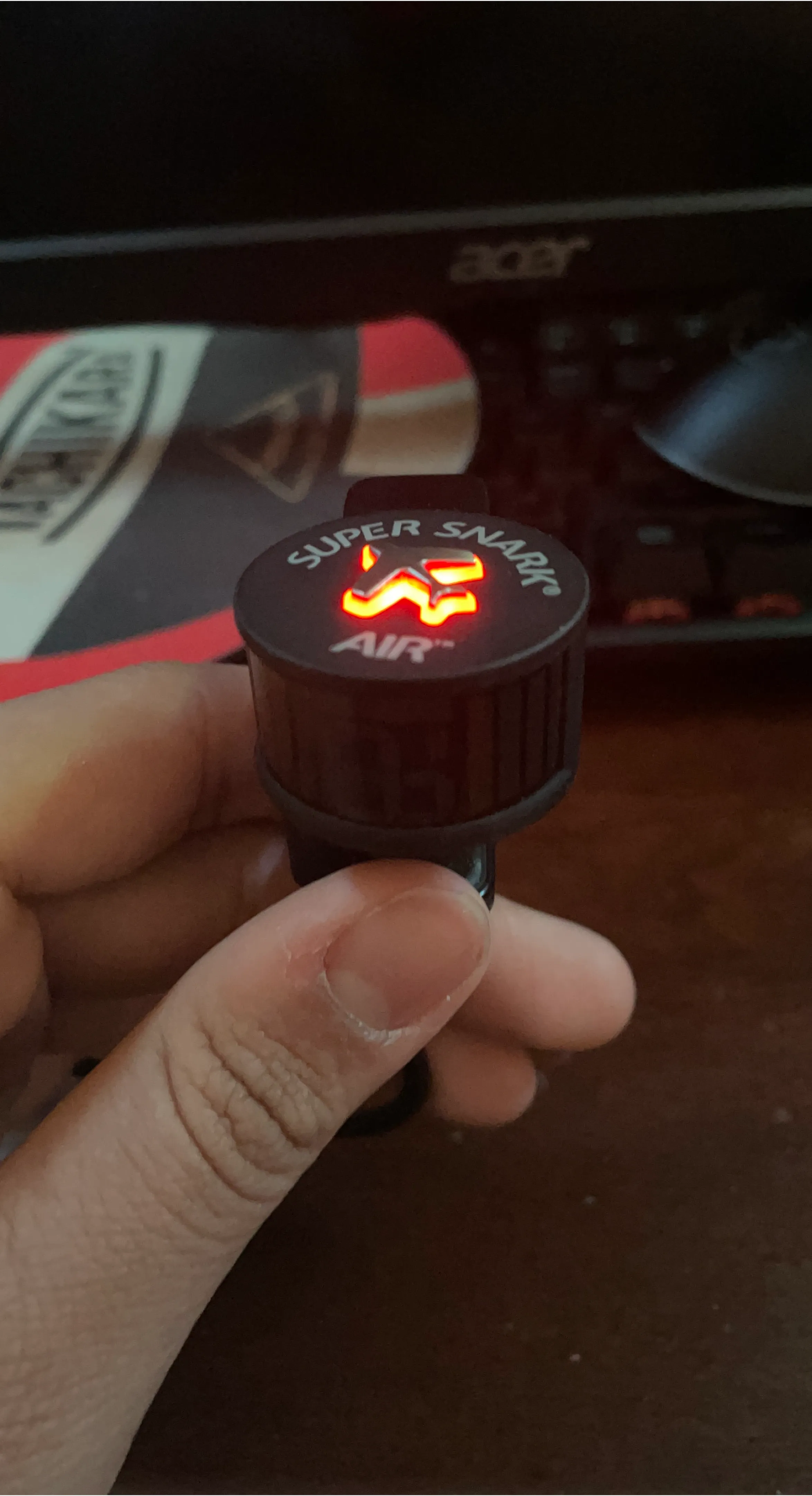 This is a Super Snark Air guitar tuner. It's black and displays tuning information with bright LEDs. Includes a USB charging port.