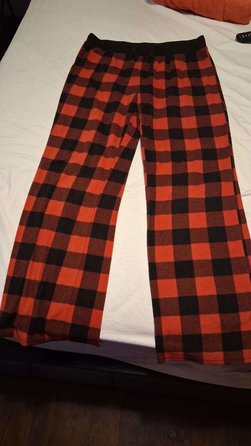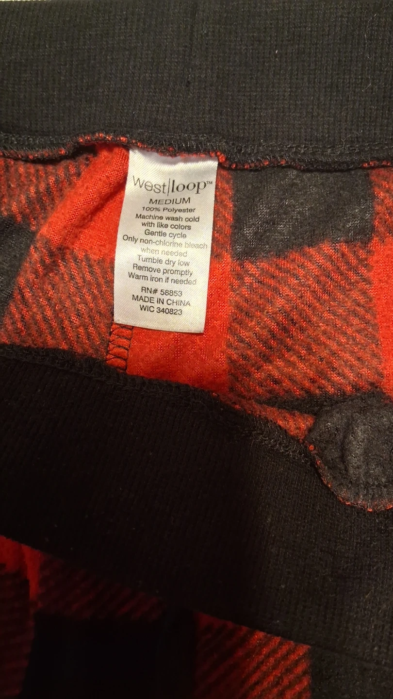 Cozy Westloop pajama pants in a red and black buffalo plaid pattern. Made of 100% polyester for ultimate comfort. These pants are size medium.